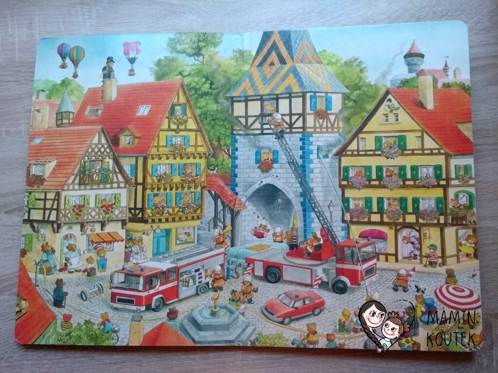 Medvědí městečko je tak trochu netradiční námět. A možná právě proto měla u nás kniha úspěch, protože vidět mámu medvědici jak vozí malého méďu v kočárku, nebo medvídky, jak se učí zpíva, to se jen tak nevidí. Oceňuji také, že kniha podněcuje dětskou fantazii. Čtenář si může vymýšlet příběhy a dávat postavám jména a kombinovat souvislosti. Navíc tím, jak jsme dokola mluvili o znázorněných postavách a aktivitách, se dcera rychle naučila nové slovíčka.