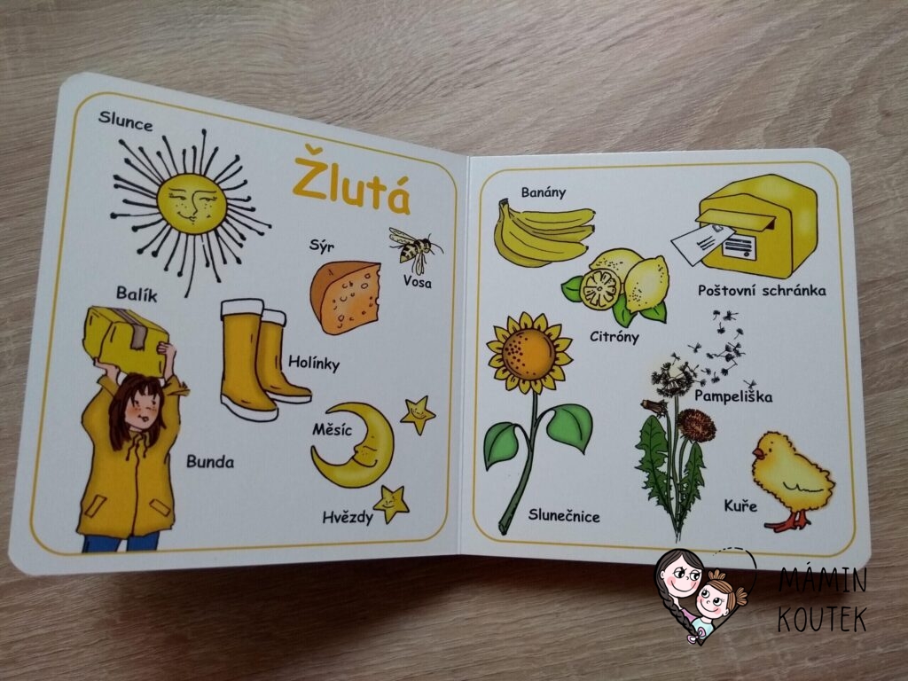 Další kniha je trošku jiná, slouží především k výuce barev. Každá dvojstránka je věnovaná jedné barvě, se kterou pak korespondují všechny znázorněné obrázky. Konkrétně se setkáváme s červenou, modrou, žlutou, zelenou, oranžovou, růžovou, fialovou, hnědou, černou a bílou. Opět super výuková pomůcka, která se bude hodit určitě každému dítěti.