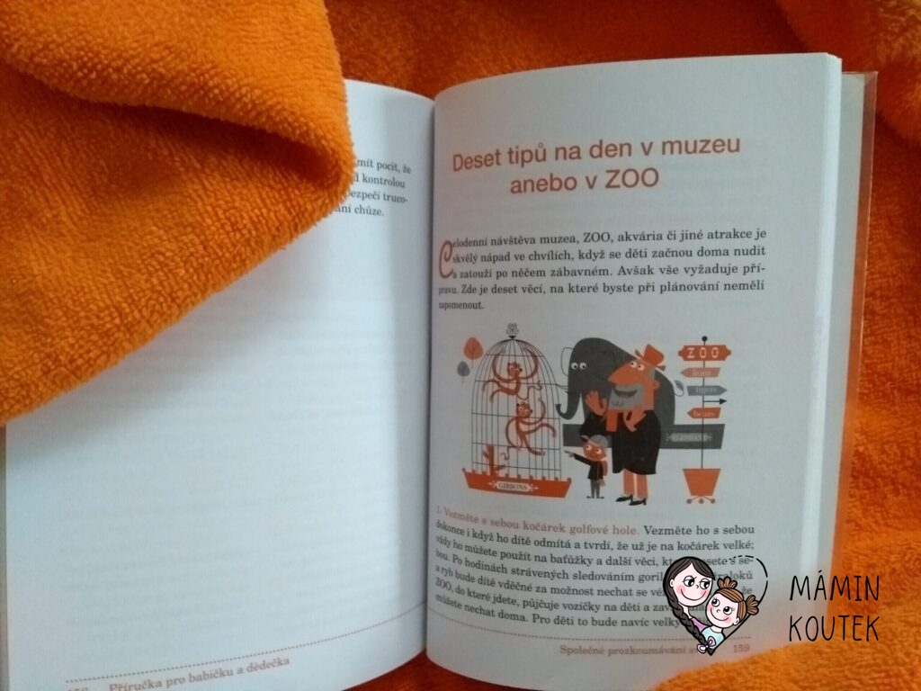 Poslední část knihy se zaměřuje na společné prozkoumání světa. To zní tajemně, co? Přitom je to opět kapitola hodně ze života. Dává totiž prarodičům rady, jak zvládnout návštěvy ZOO nebo restaurace, co znamená zoubková víla, co dělat s dětmi po škole, co dětem číst, jak cestovat vlakem nebo autobusem a mnoho dalšího.