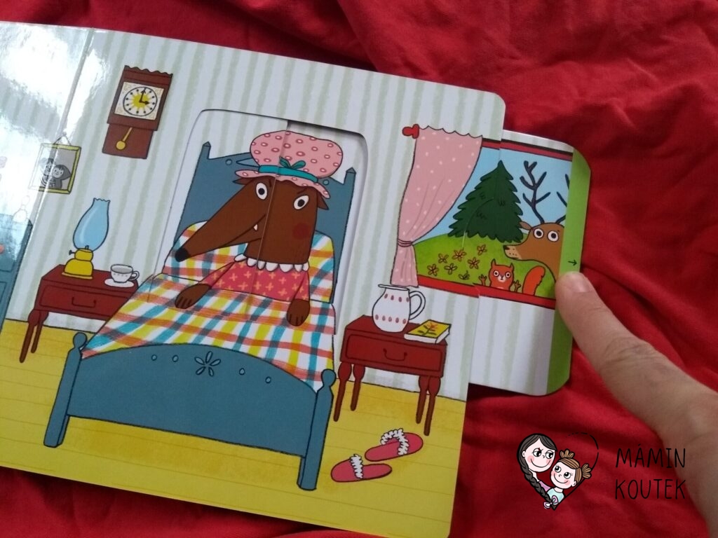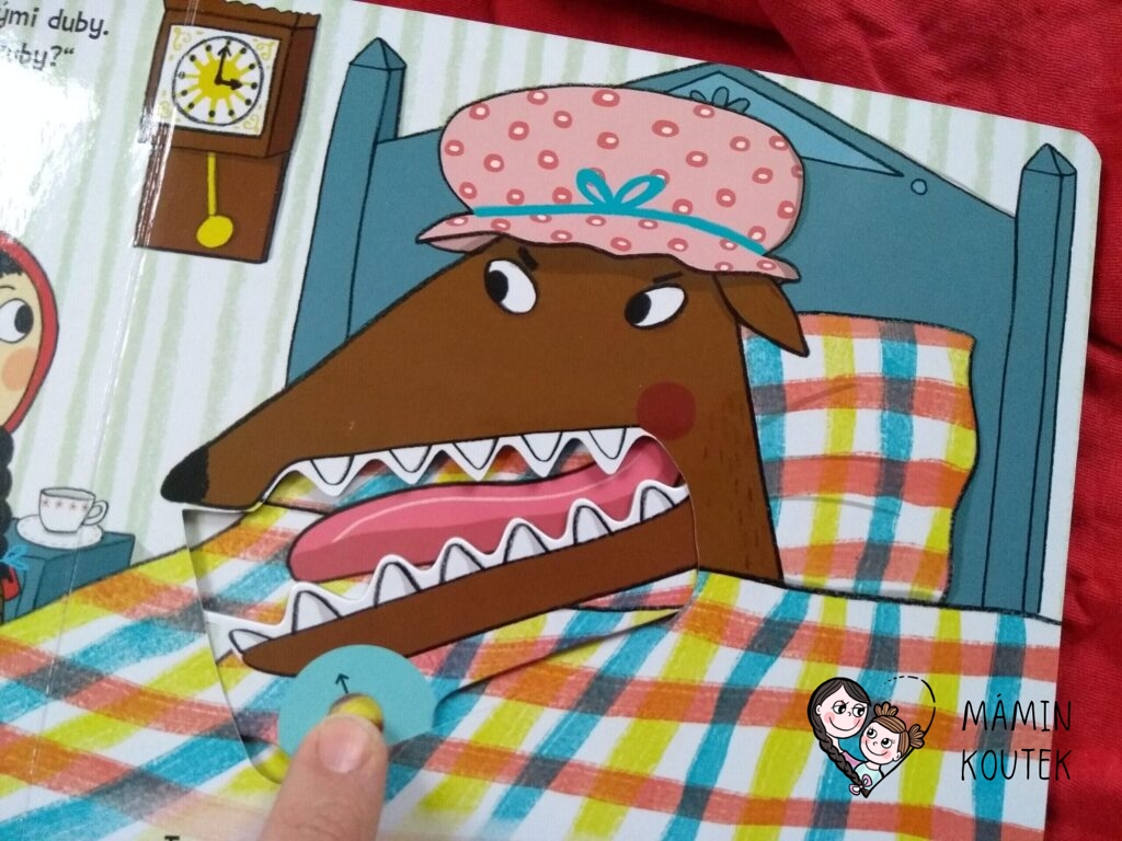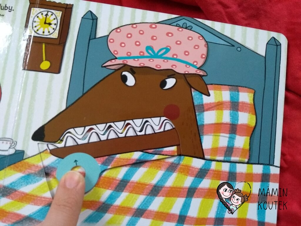 Poté přichází do pokoje Karkulka, na kterou si vlk už brousí zuby. Jak cvakají se mohou přesvědčit samy děti tím, že modré kolečko posunují nahoru a dolů.
