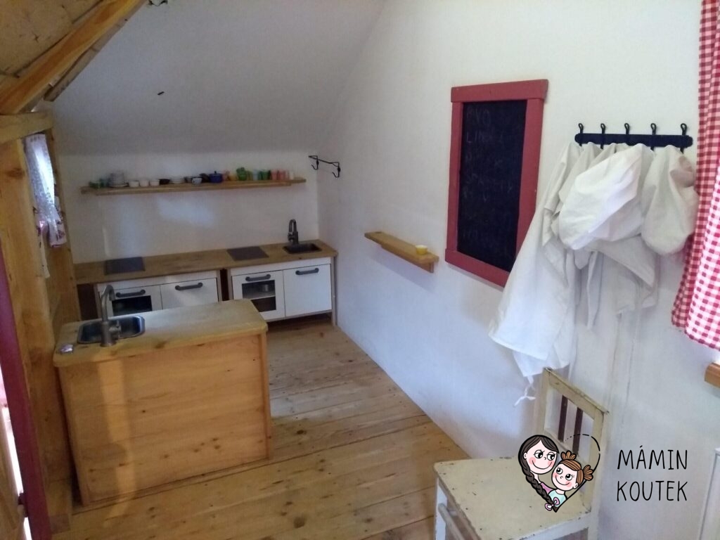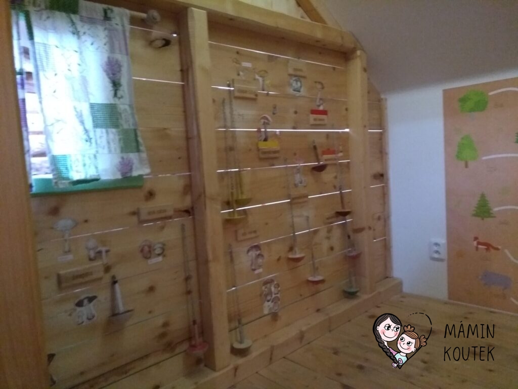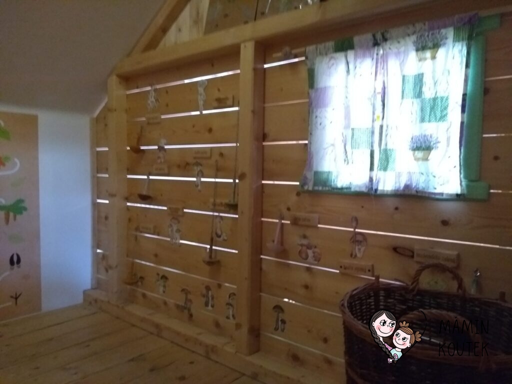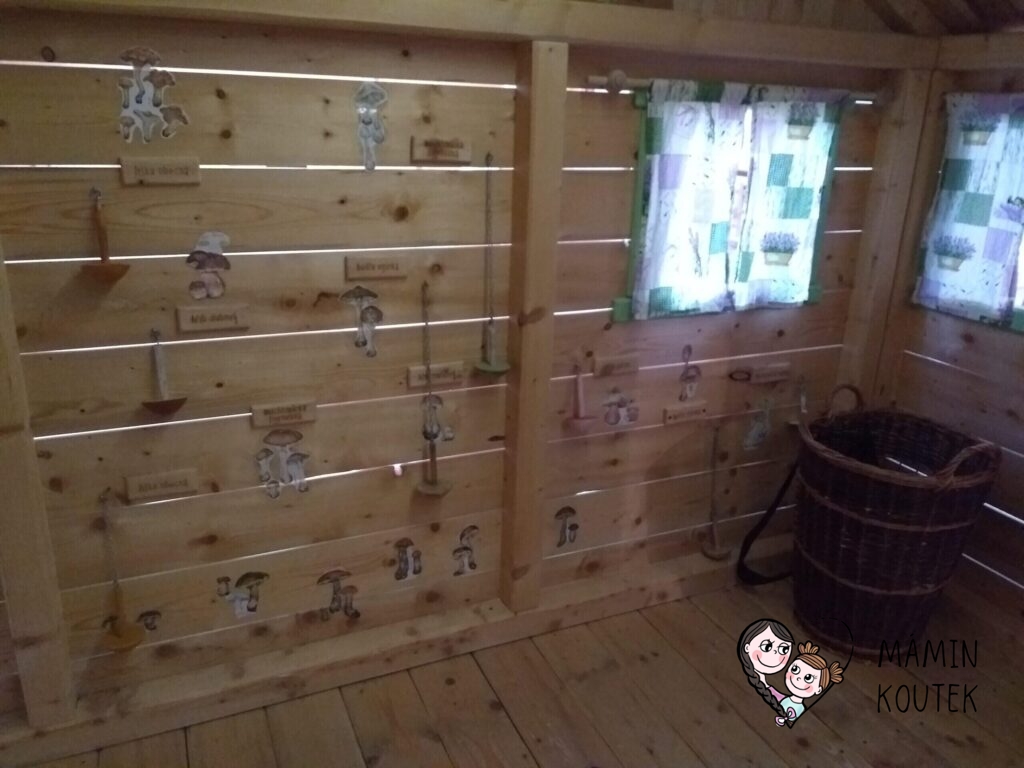 Hned vedle stojí dřevorubcová chatrč, ve které najdeme například jednoduchou spojovačku nebo obrázky a dřevěné makety hřibů. Ty visí po celé stěně a děti si je mohou také osahat a podrobně prohlédnout.
