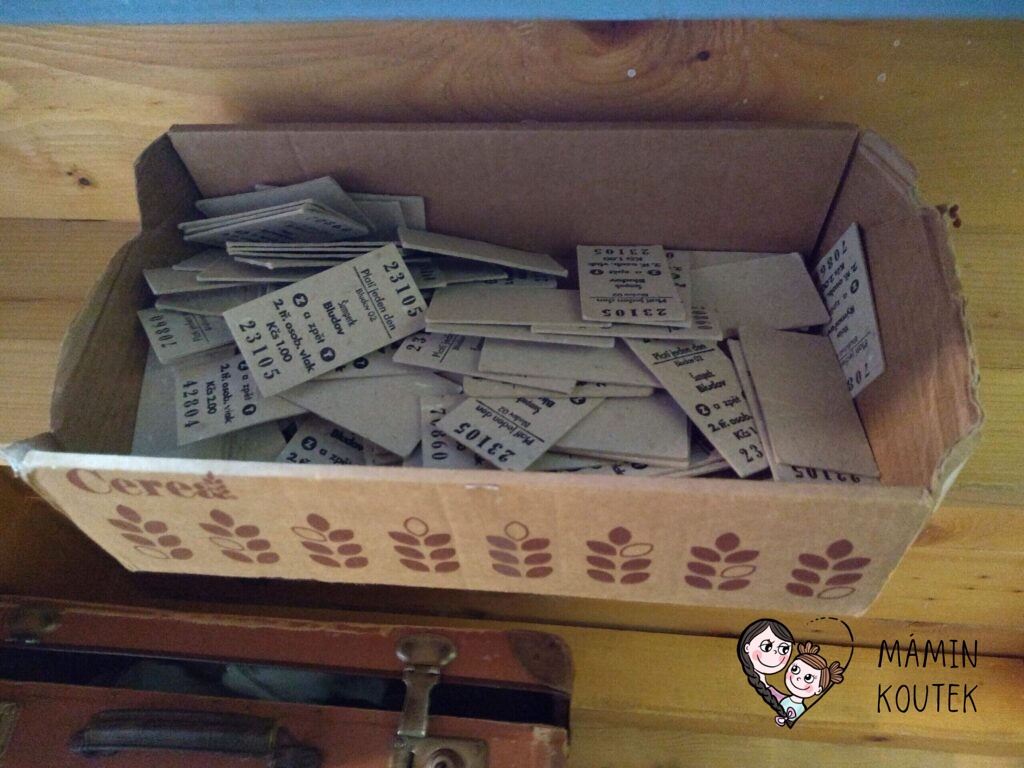 Poslední domeček je nádražní budova. Pamatujete na staré vlakové lístky? Tak těch tady najdeme plnou krabici. Z toho jsem byla více nadšená já než děti. 😀 Ty zaujal alespoň kufr plný věcí, kde mohly vesele krámovat.