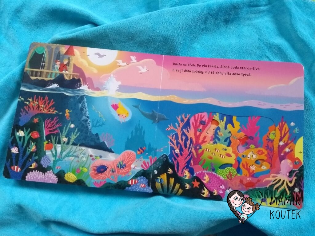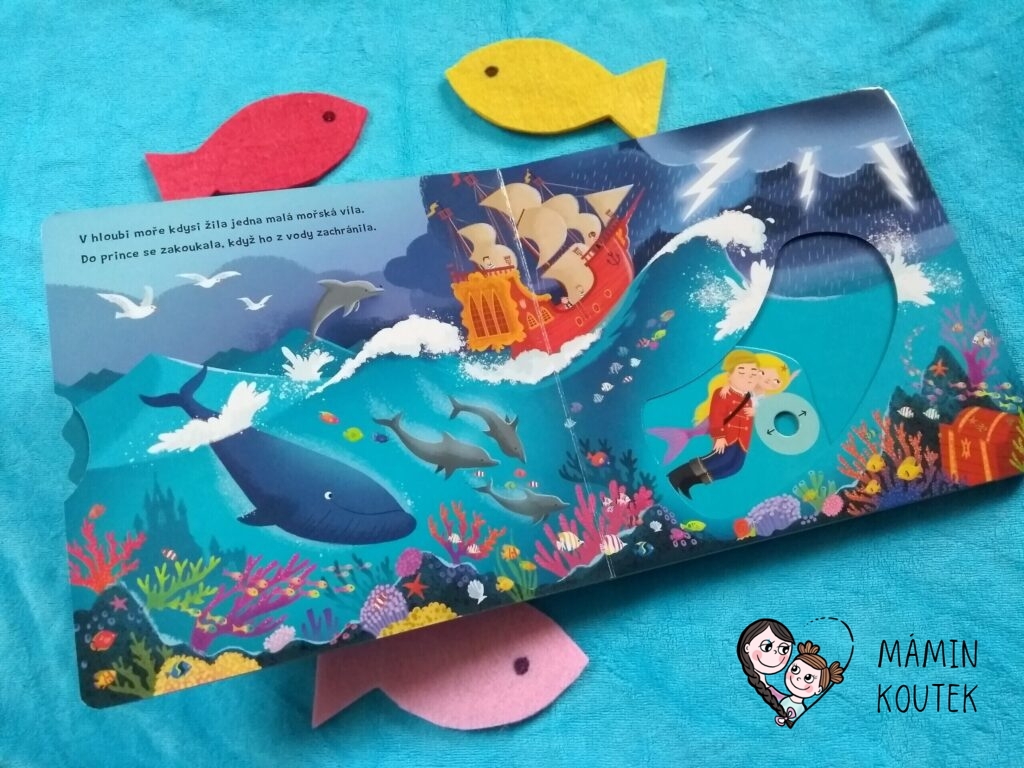 Na úvodní stránce se setkáváme s malou mořskou vílou, o které je celý příběh. Kolem víly je spoustu rybiček, které se hýbou otáčením kolečka na pravé straně knihy.