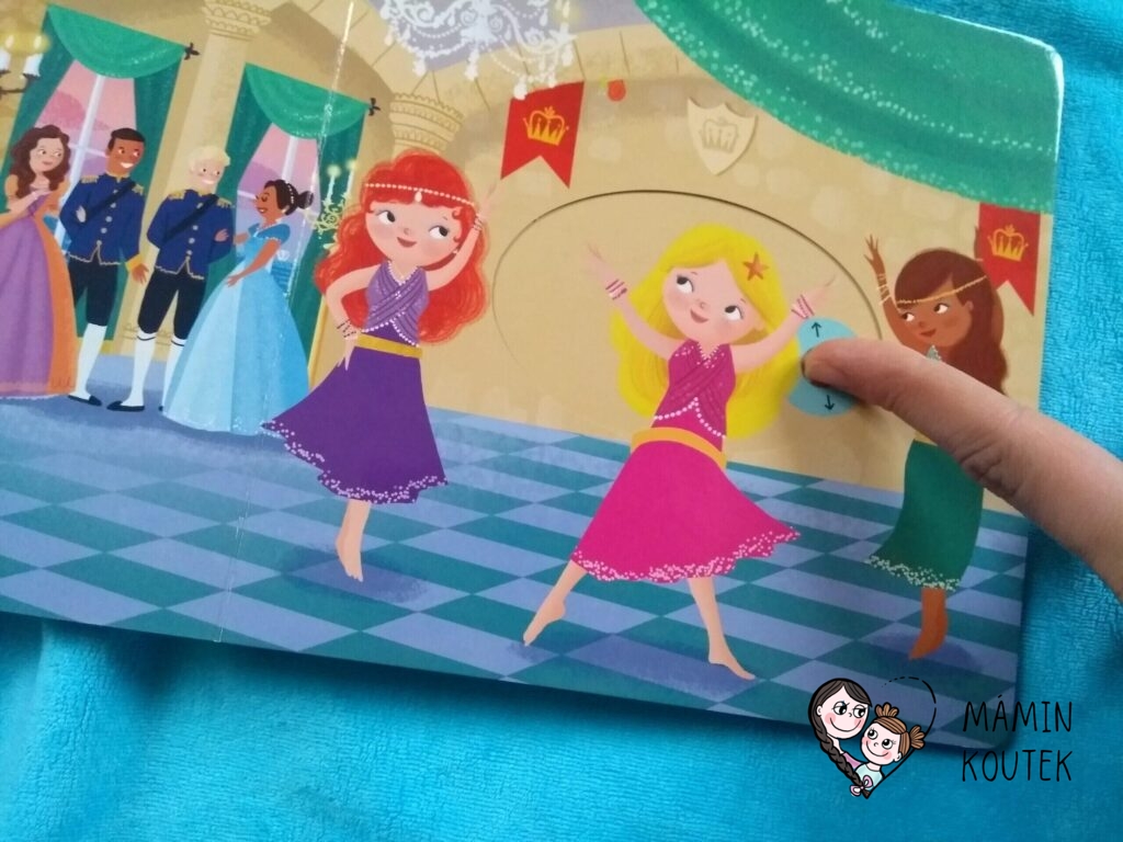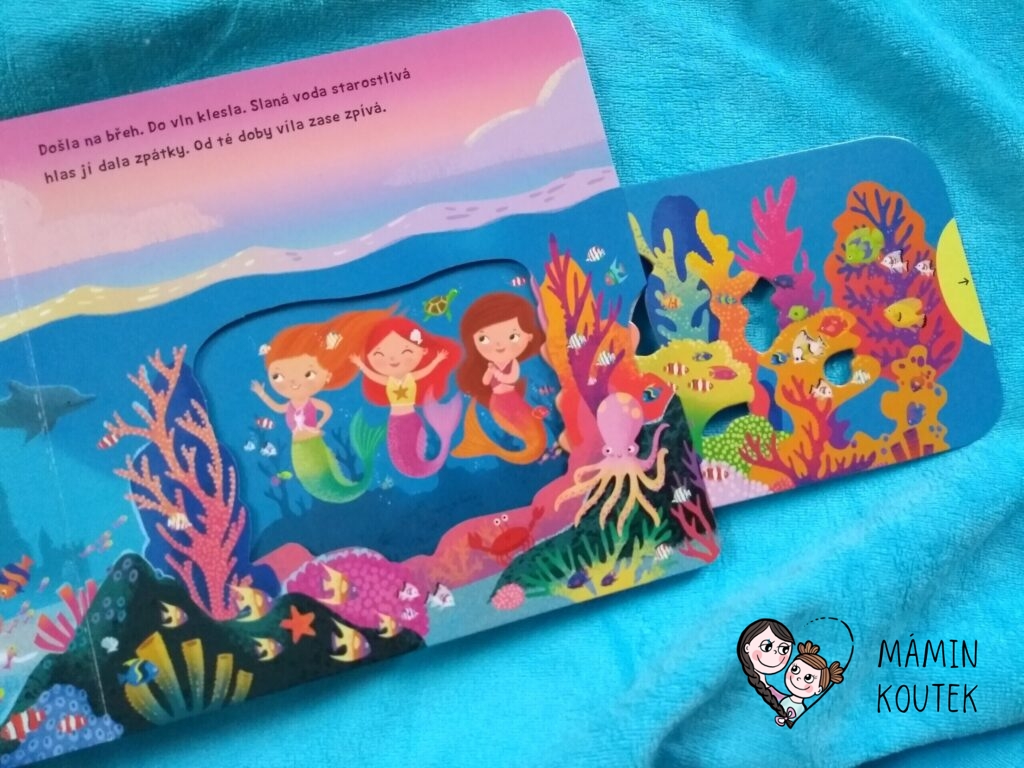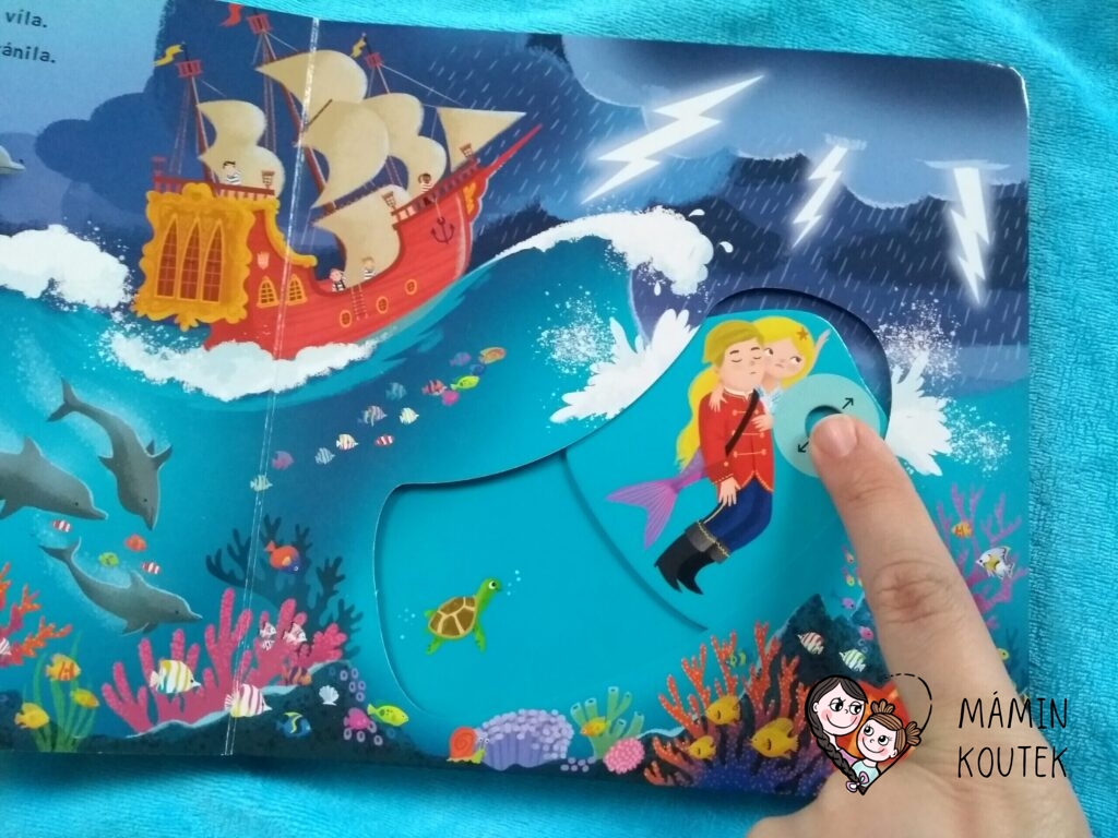 Příběh pak začíná na další dvojástránce. Mořská víla se zde zakouká do prince, který spadl do moře a kterého zachránila. Jak? Vytáhla ho nad vodu, což si mohou vyzkoušet i samy děti.