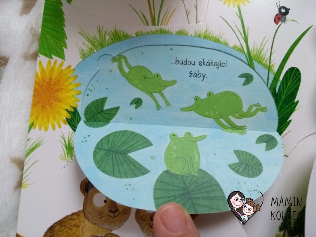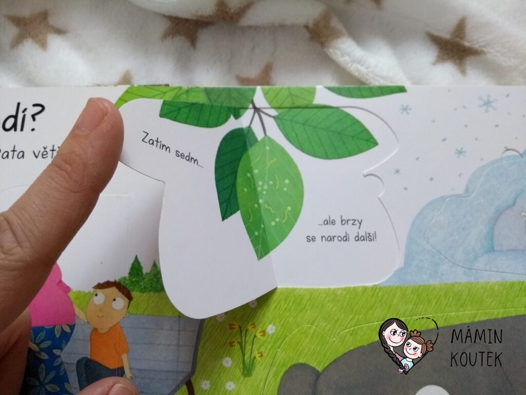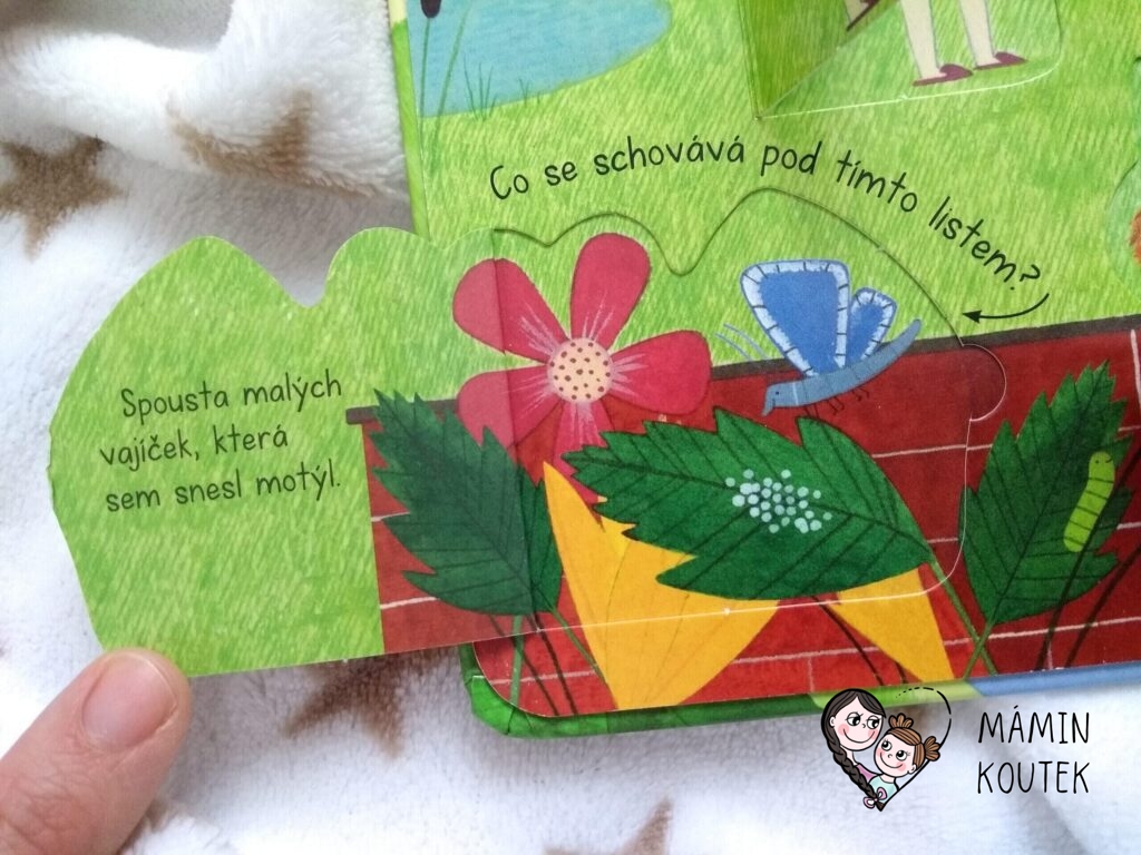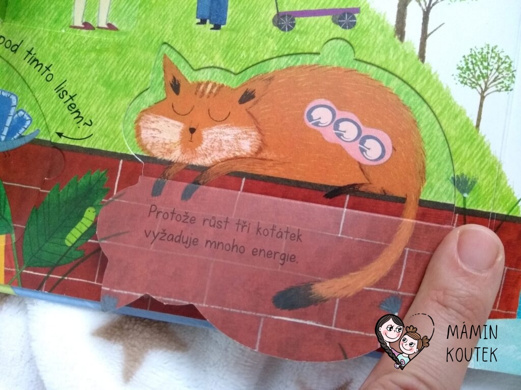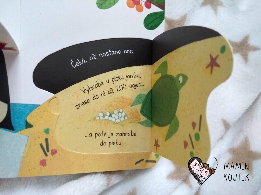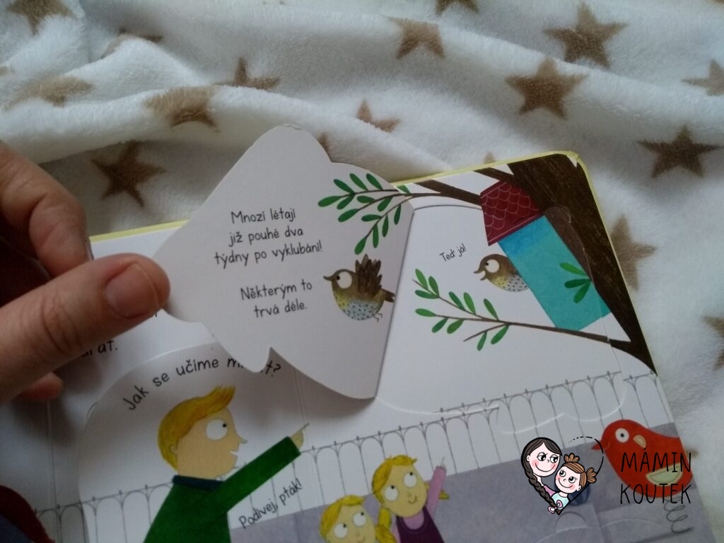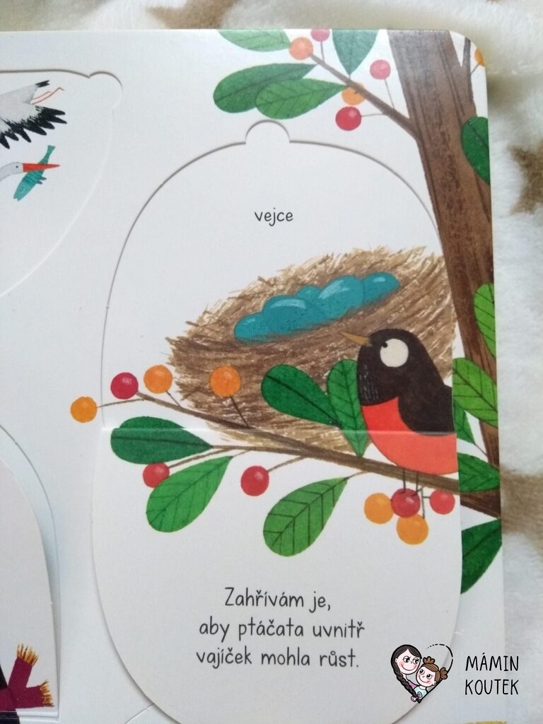 Dále vidíme různá zvířátka – kočičku, motýlka, čápa, tučňáka, želvu nebo třeba ptáčka. Pokud odklopíme u zvířátek okénka, dozvíme se různé zajímavosti. Třeba že motýl snáší vajíčka na listy květin, ptáček zahřívá své vajíčka v hnízdě a želva je v noci schovává pod písek. Nebo že čápi děti nenosí, i když se to často traduje.