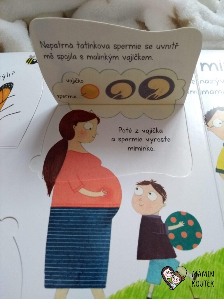 U maminky zjistíme, že miminko vzniklo tak, že se tatínkova spermie uvnitř maminky spojila s vajíčkem a z toho roste malé miminko. V dalším obrázku se také řeší, jestli to bude chlapeček nebo maminka. Tatínek vysvětluje, že on má spermie dívčí i chlapecké a všechny závodí k vajíčku. Kdo vyhrál ještě neví.
