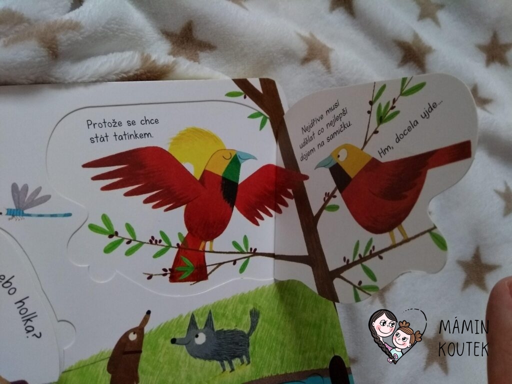 V knížce se potkáváme také s ptáčky, rybičkami nebo žábou. Věděli jste, že ptáci spolu jakoby tančí? Chtějí zjistit, jestli se k sobě hodí a jestli spolu mohou založit rodinu.