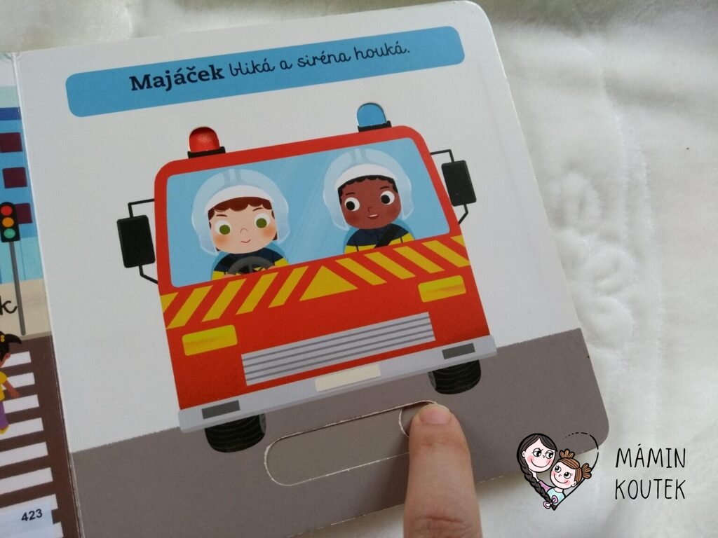 Na další stránce vidíme, jak hasičské auto vyráží do akce. Děti si mohou vyzkoušet, jak se mění v majáčku barvy díky posunování v dolní části stránky.