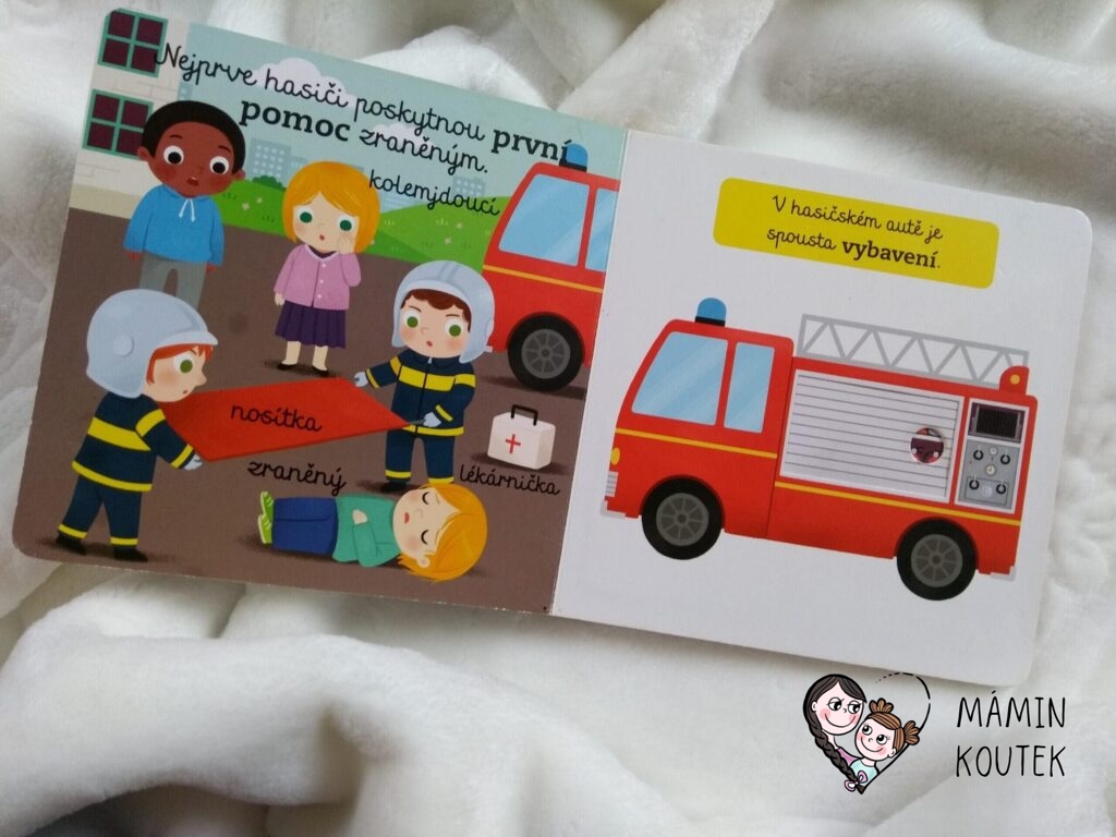 Na první stránce se setkáme s velkým hasičským autem a dvěma hasiči. Oproti knihám v sérii Tlač, táhni, posouvej není na úvodní stránce žádná pohyblivá část, jedná se o prostý obrázek.