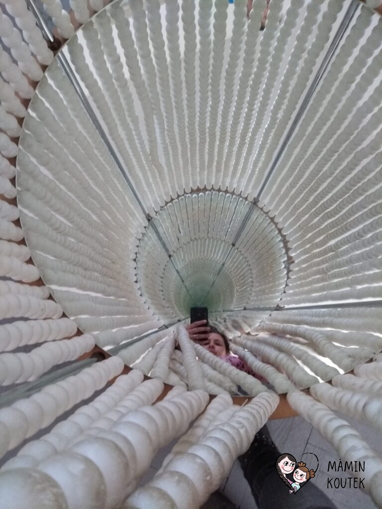 Dceři se nejvíce líbilo kruhové zrcadlo, kolem kterého visely polystyrenové kuličky. Když jste je odhrnuli a podívali se dolů, naskytl se vám zajímavý pohled, jako by pod vámi byla nekonečná hloubka.