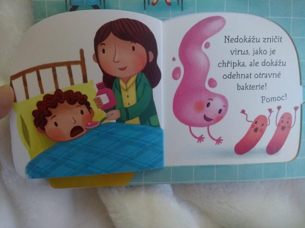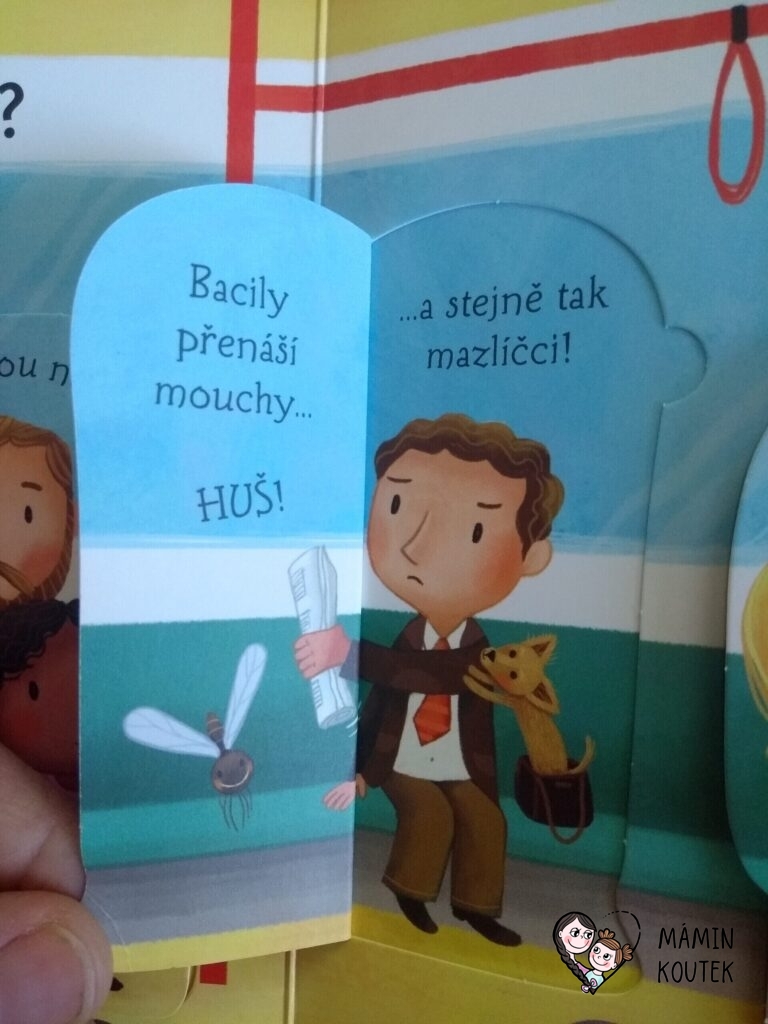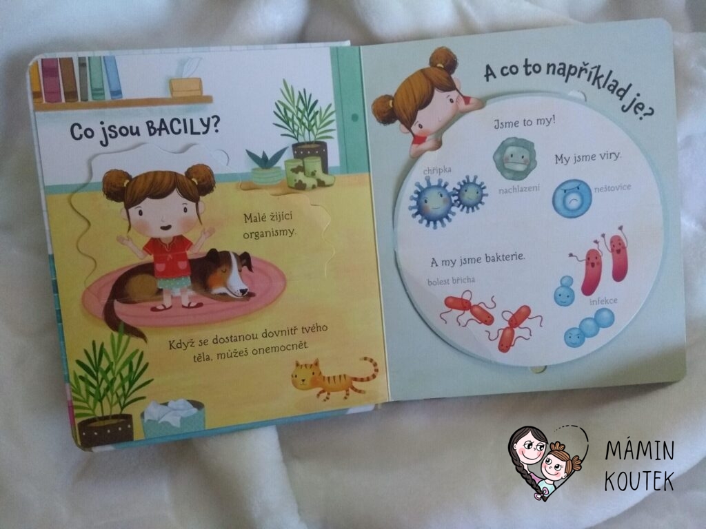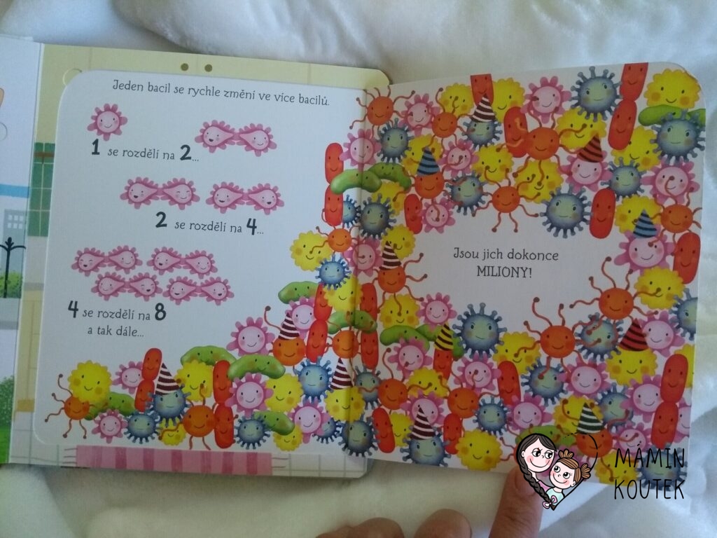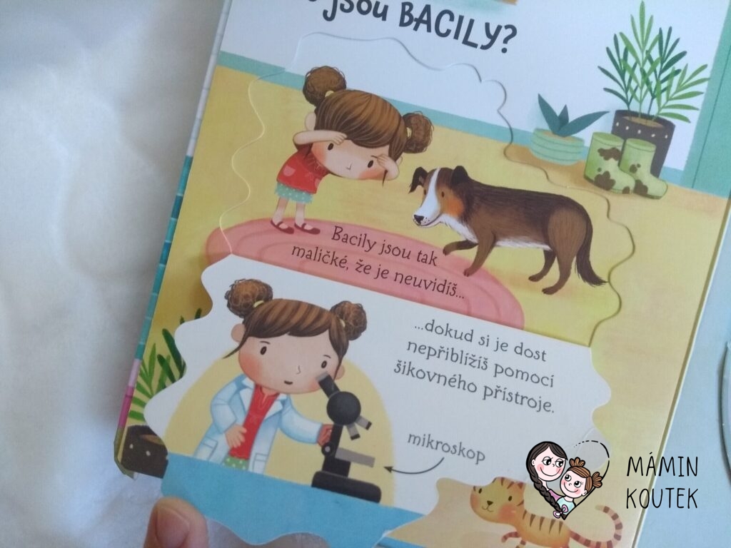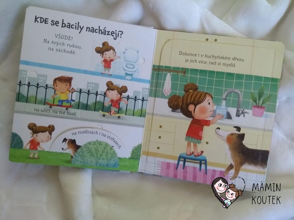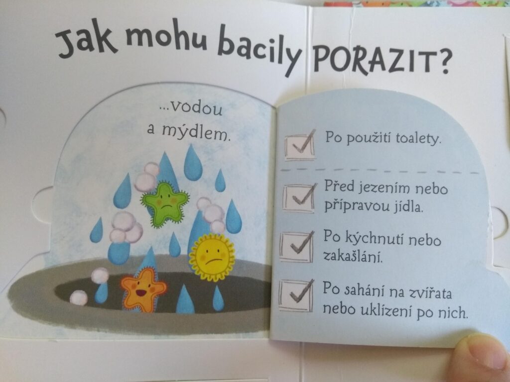 V knize se děti hravou a zábavnou formou seznámí s bacily, jejich výskytem i tím, jak se jich zbavit. Je zde hodně otevíracích okýnek, barevných ilustrací a doprovodných textů. Vše je v podobě leporela, takže hrubé stránky, které se jen tak nezničí. Na první pohled mě kniha moc nezaujala a přišla mi těžká. Dcera si ji ale začala sama od dvou let prohlížet, a tak si u nás získala čestné místo.