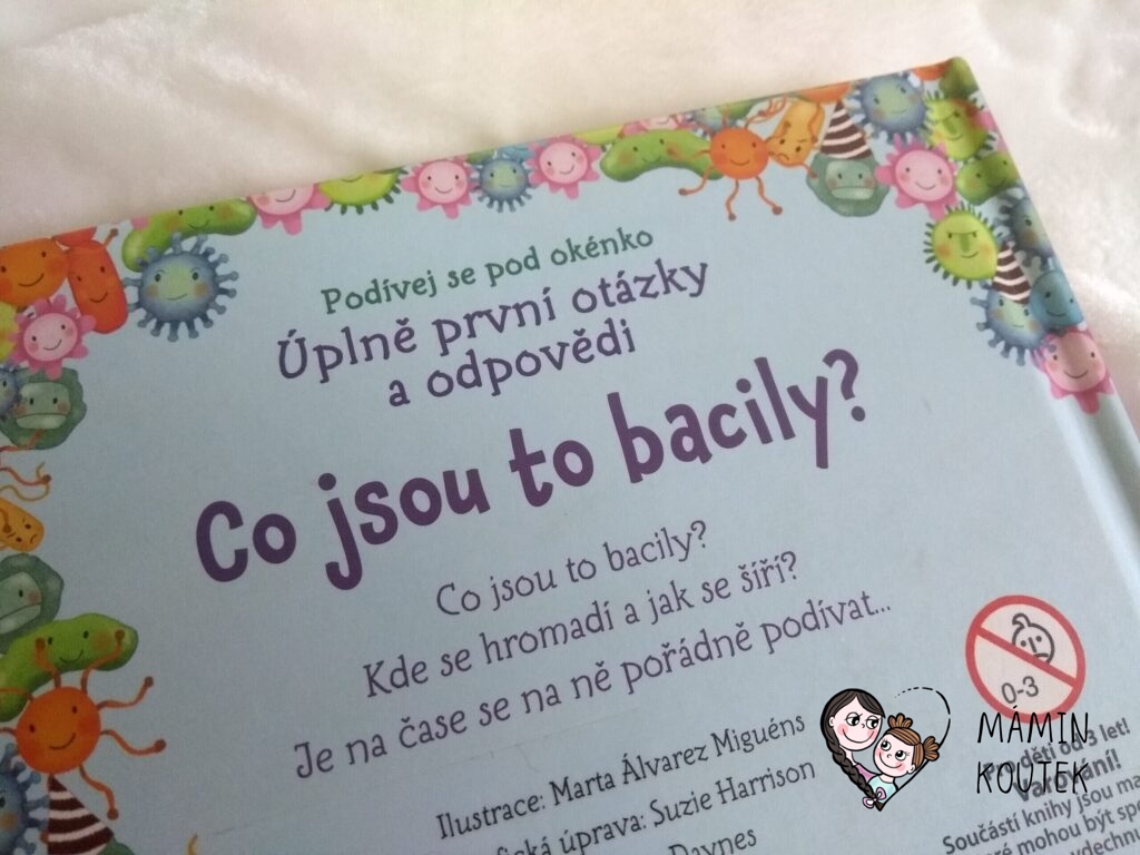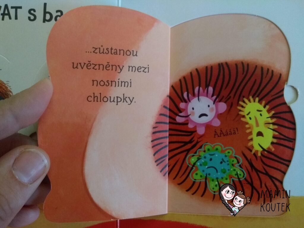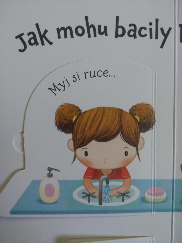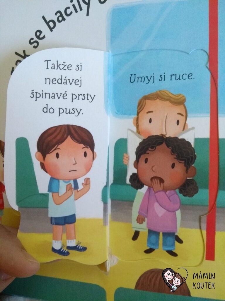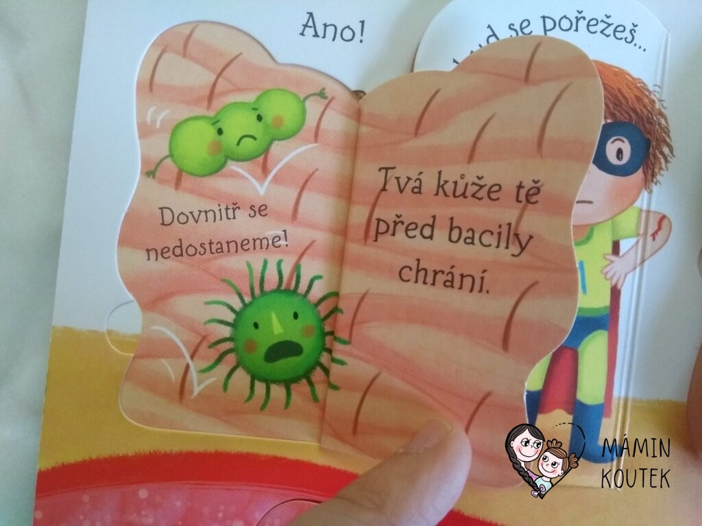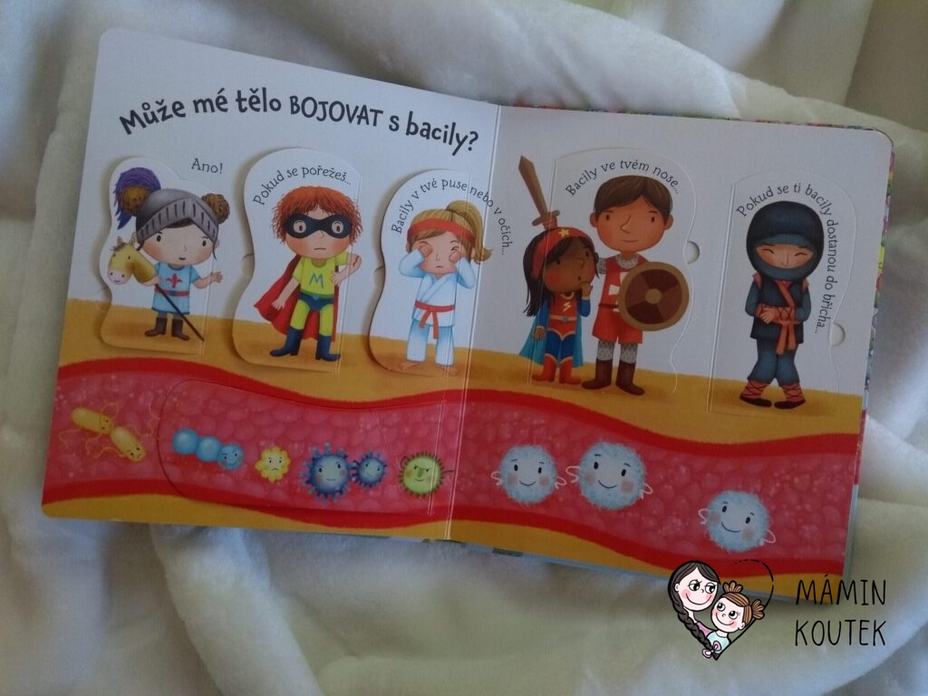 V knize se děti hravou a zábavnou formou seznámí s bacily, jejich výskytem i tím, jak se jich zbavit. Je zde hodně otevíracích okýnek, barevných ilustrací a doprovodných textů. Vše je v podobě leporela, takže hrubé stránky, které se jen tak nezničí. Na první pohled mě kniha moc nezaujala a přišla mi těžká. Dcera si ji ale začala sama od dvou let prohlížet, a tak si u nás získala čestné místo.