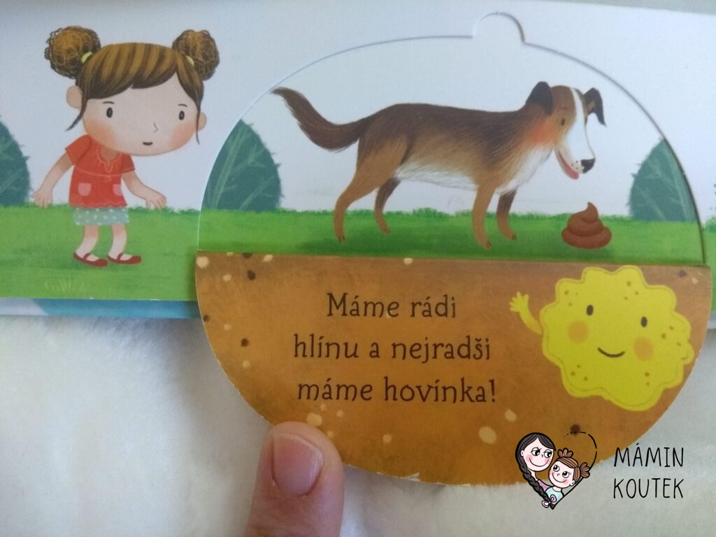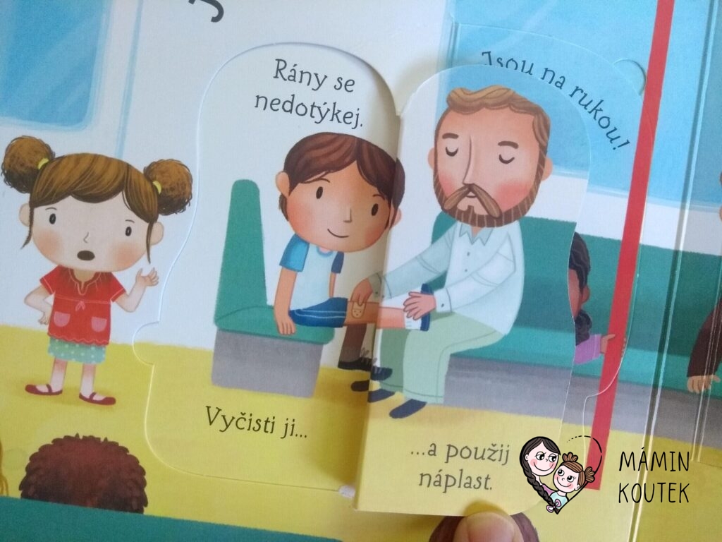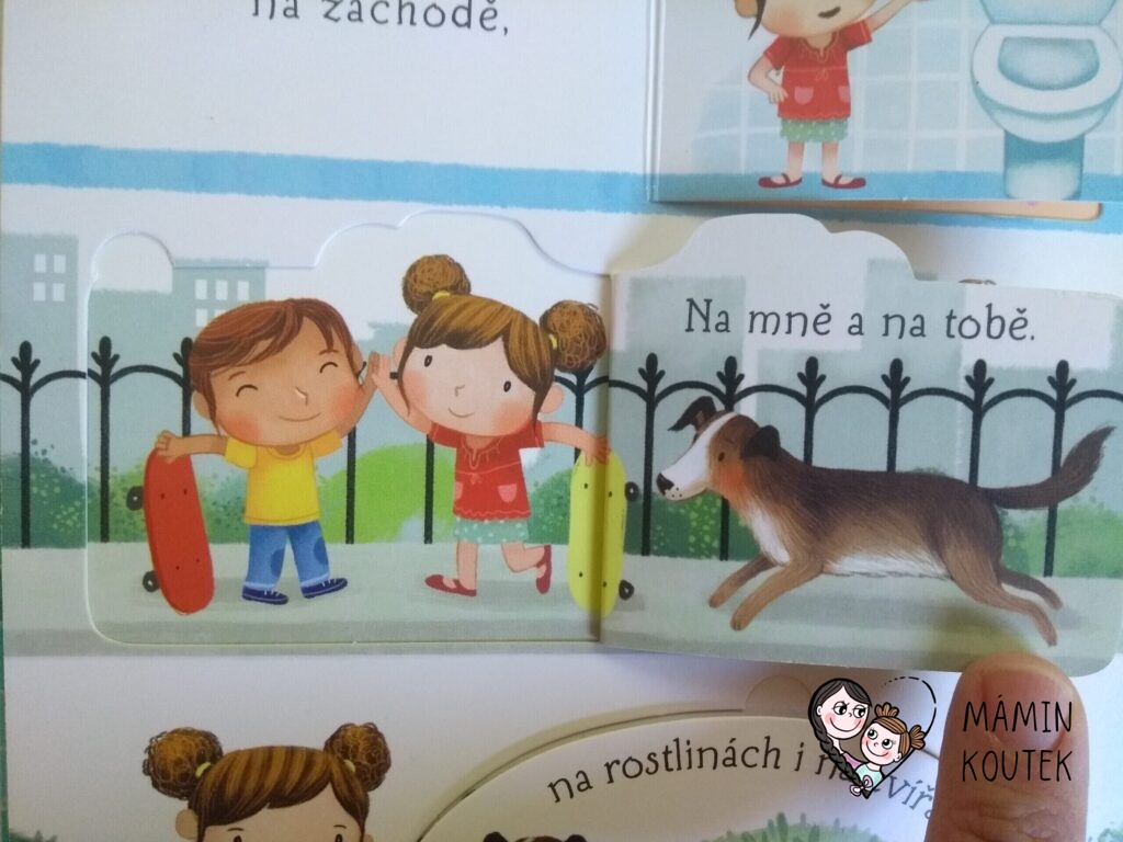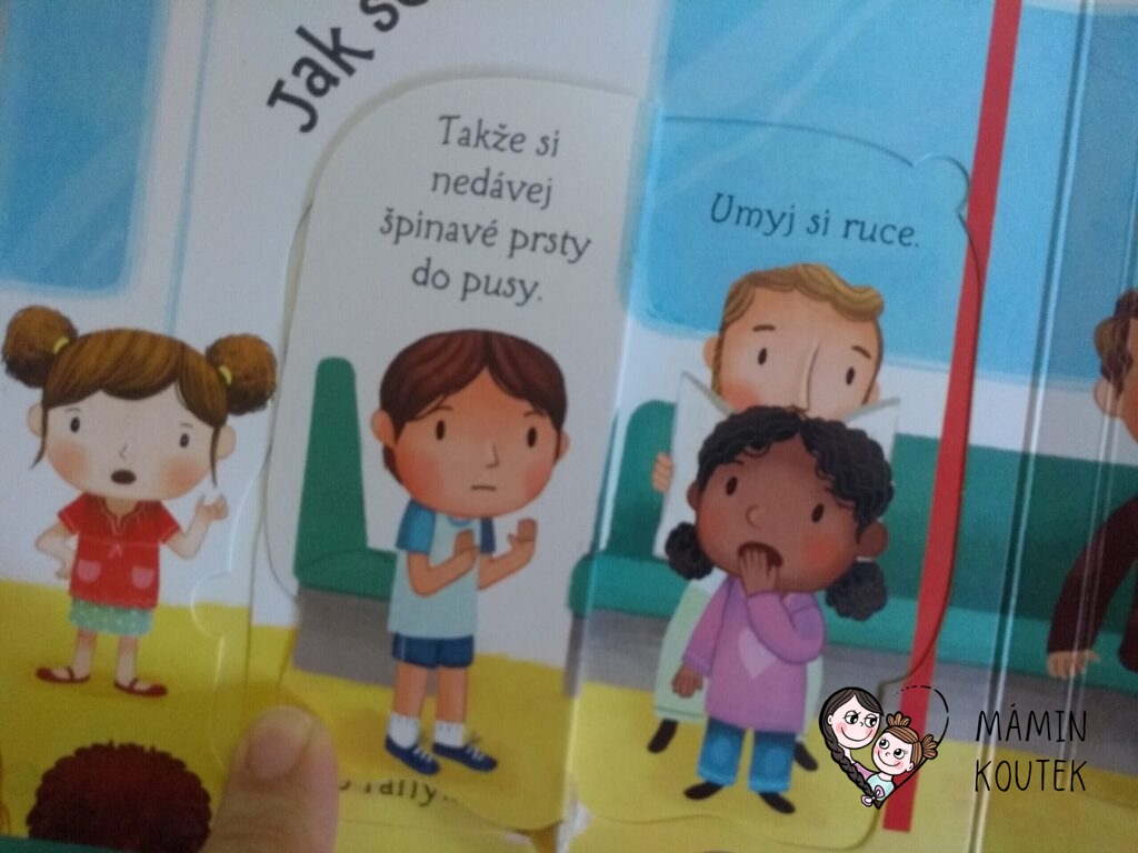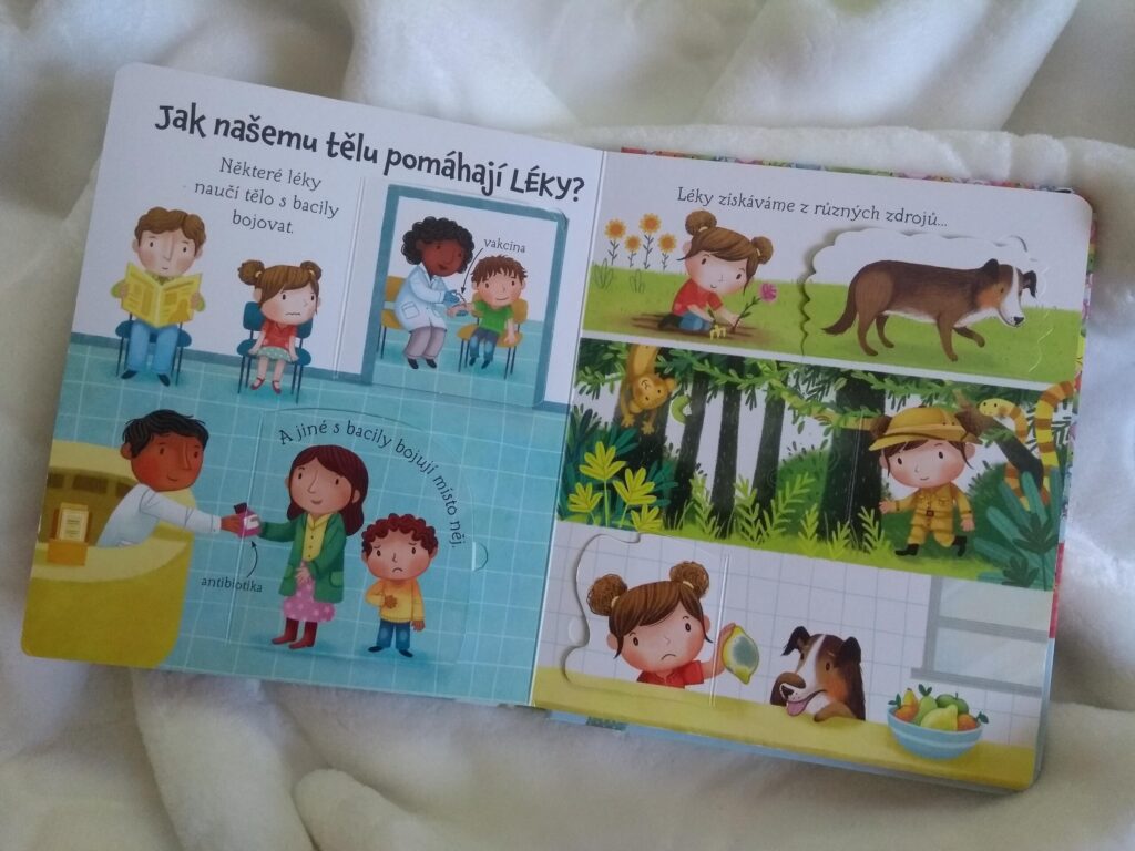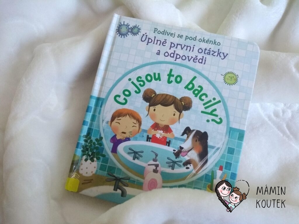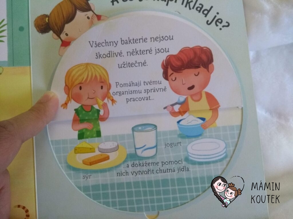 V knize se děti hravou a zábavnou formou seznámí s bacily, jejich výskytem i tím, jak se jich zbavit. Je zde hodně otevíracích okýnek, barevných ilustrací a doprovodných textů. Vše je v podobě leporela, takže hrubé stránky, které se jen tak nezničí. Na první pohled mě kniha moc nezaujala a přišla mi těžká. Dcera si ji ale začala sama od dvou let prohlížet, a tak si u nás získala čestné místo.