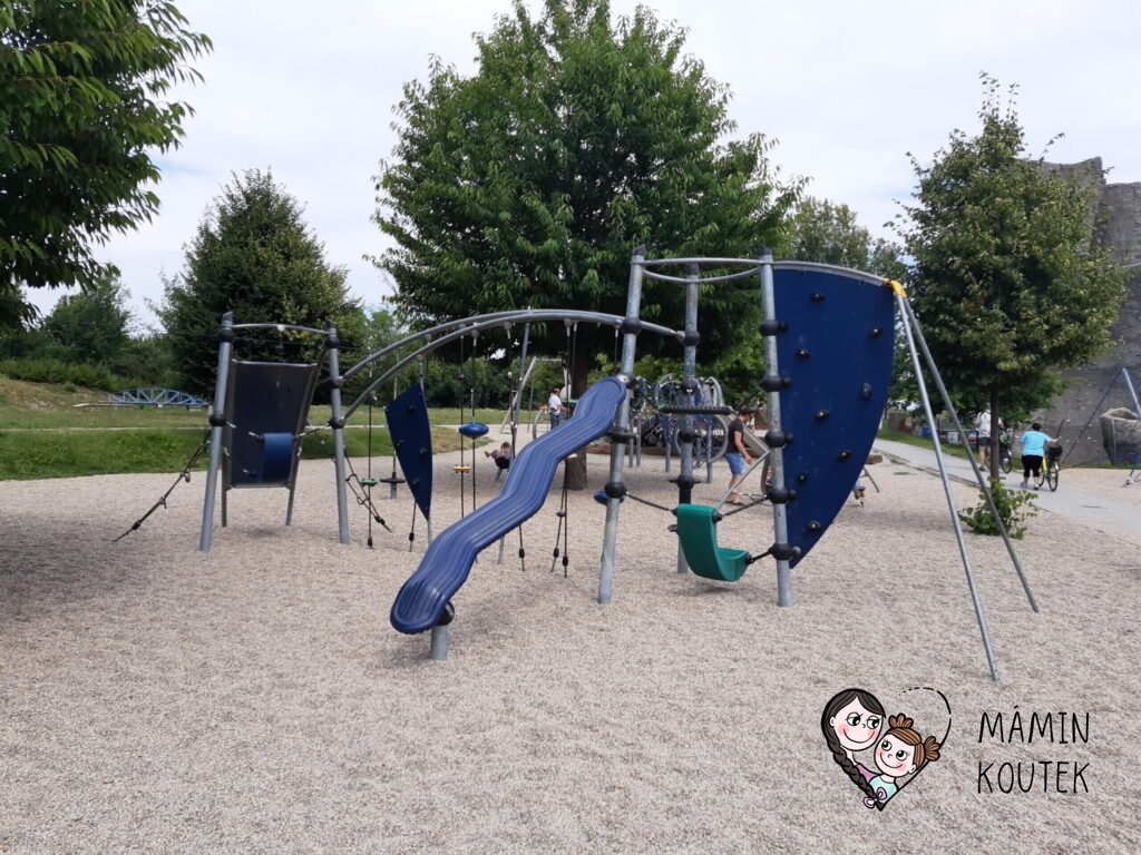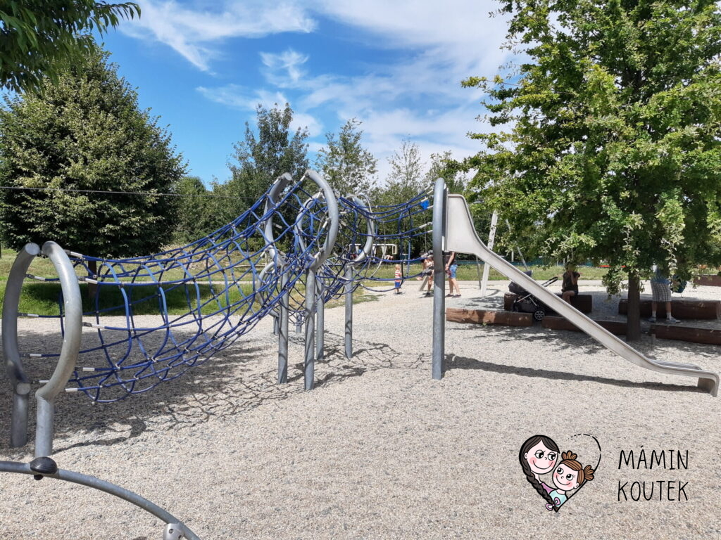 Pro naší dvouleťačku bylo mnohem zajímavější hřiště pro malé děti, kde byla klouzačka, houpačka, lanová stěna a mnoho dalšího.
