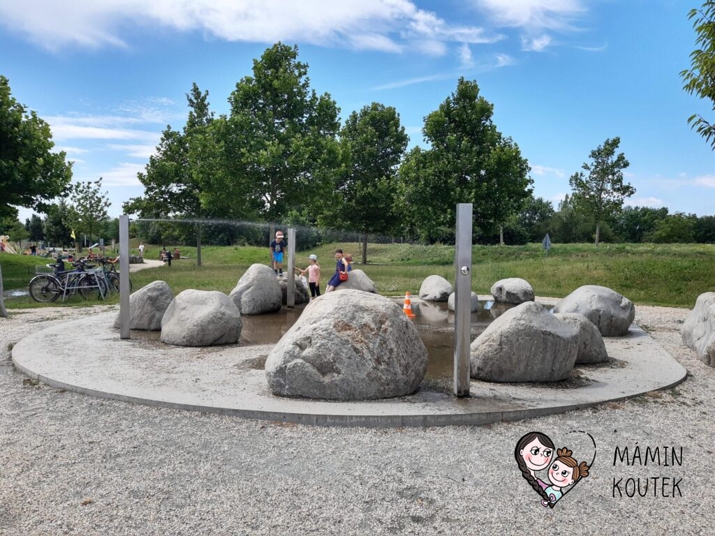 Protože bylo teplo, ocenili jsme vodní koutek, kde bylo několik vodních děl, se kterými se dalo různě stříkat. Bohužel knoflík, kterým se voda zapínala, byl na naši dvouleťačku hodně vysoko, takže sama stříkat nemohla. Aspoň se ale proběhla v kalužích. Jen pozor, hodně to klouzalo, takže se děti musí hlídat, aby nespadly.