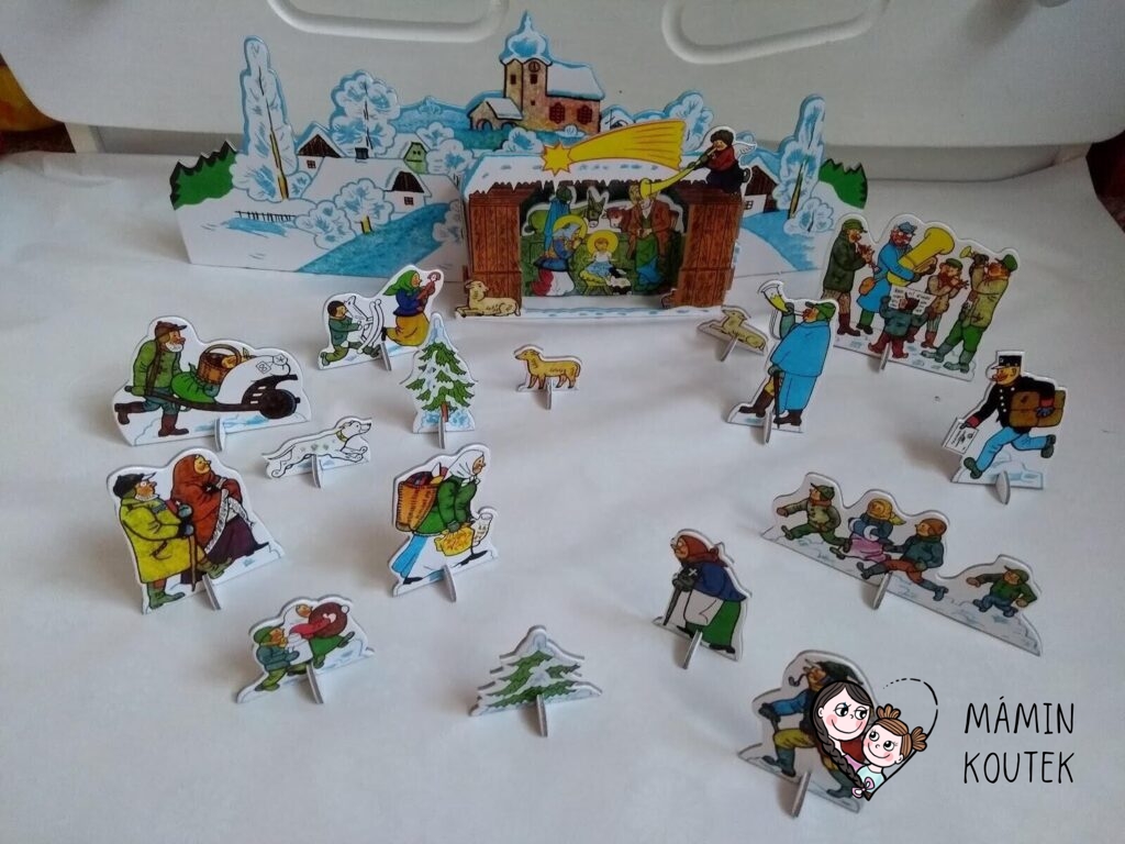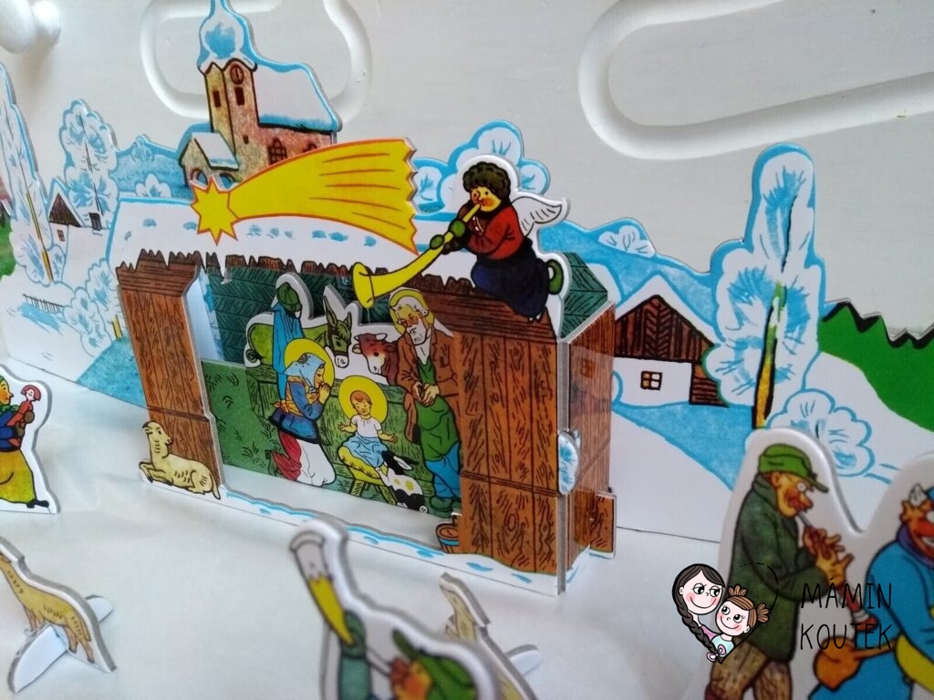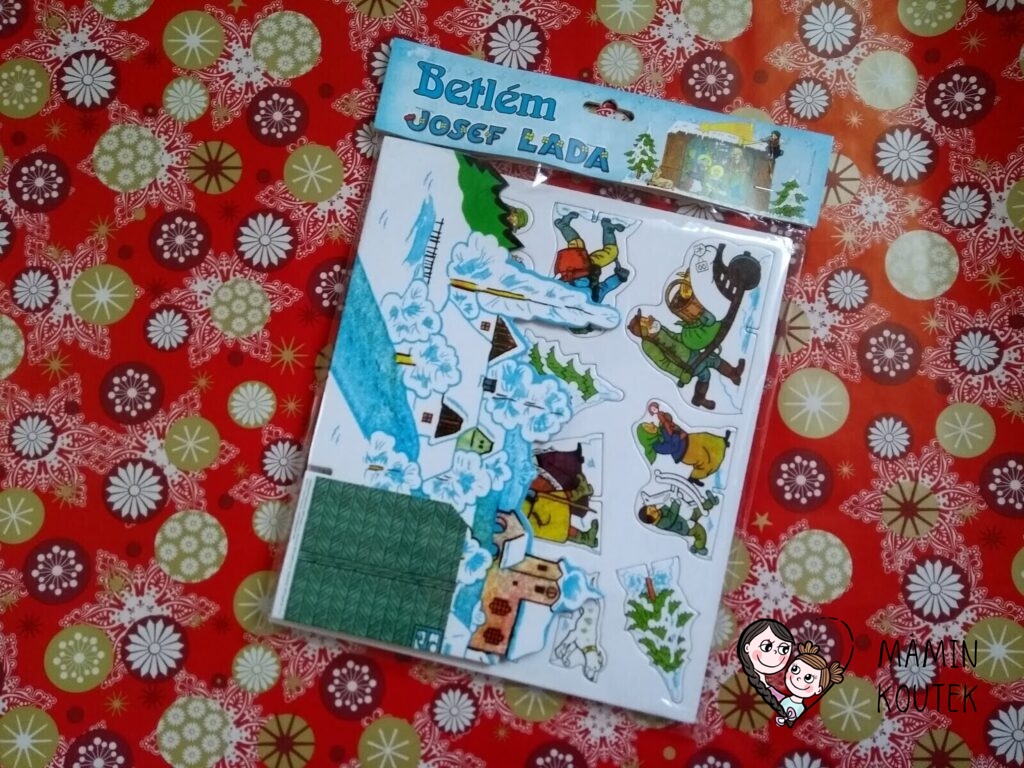 Tento betlém jsme koupili už loni (kompletní recenze zde). Má spoustu figurek s postavami osob i zvířátek, vše ve stylu Josefa Lady, takže krásně barevné, pestré a pro děti poutavé. Betlém je vyroben z tvrdšího kartonu, takže je celkem odolný (Beky si s figurkami hrála nebo je aspoň pořád někde přenášela a přežily bez úhony).