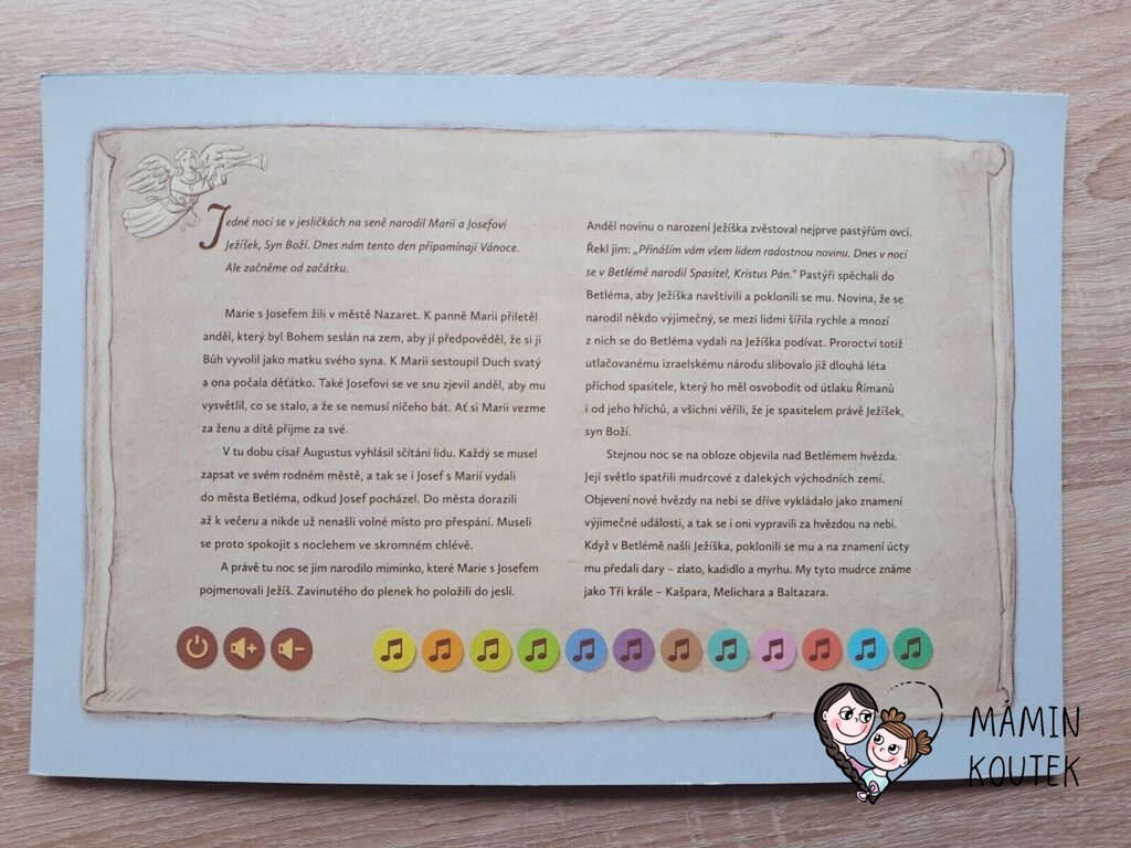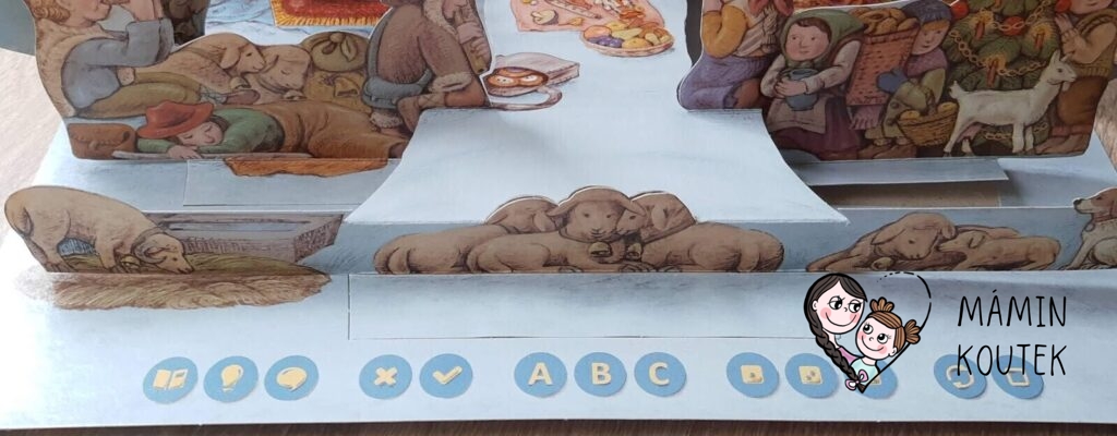 Ilustrace jsou ve starém stylu, takže doporučuji spíše pro starší děti od 3-4 let. Pokud děti na betlém ukáži tužkou, postavy vydávají zvuky nebo se o nich něco zajímavého dozvíme, takže se opět nejedná jen o betlém, který byste někde položili a hotovo. Na zadní straně navíc najdete také ikony, díky kterým si můžete poslechnout hned několik vánočních koled.