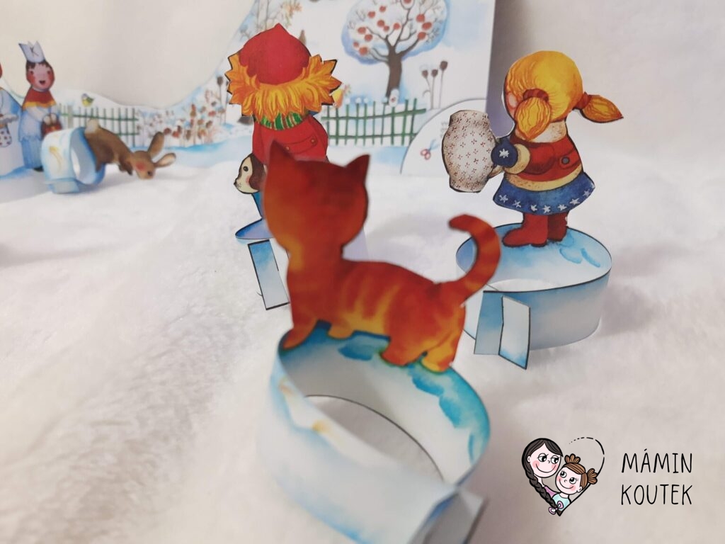 Každá postava má svůj podstavec, díky čemuž vydrží stát. My ho měli loni postavený na televizní skříňce vedle stromečku. Beky si s postavičkami dělala i takové své „divadlo“.