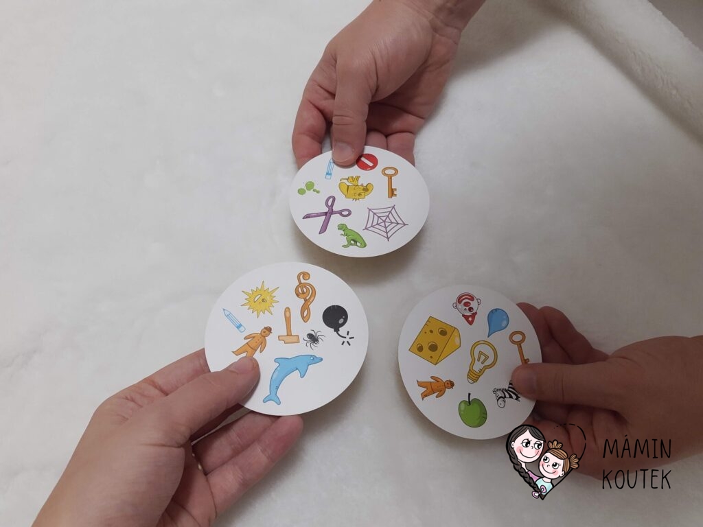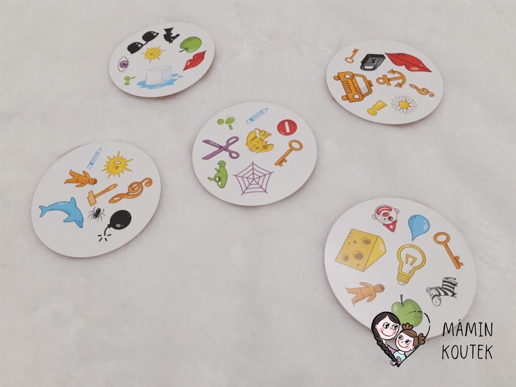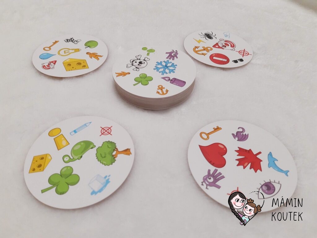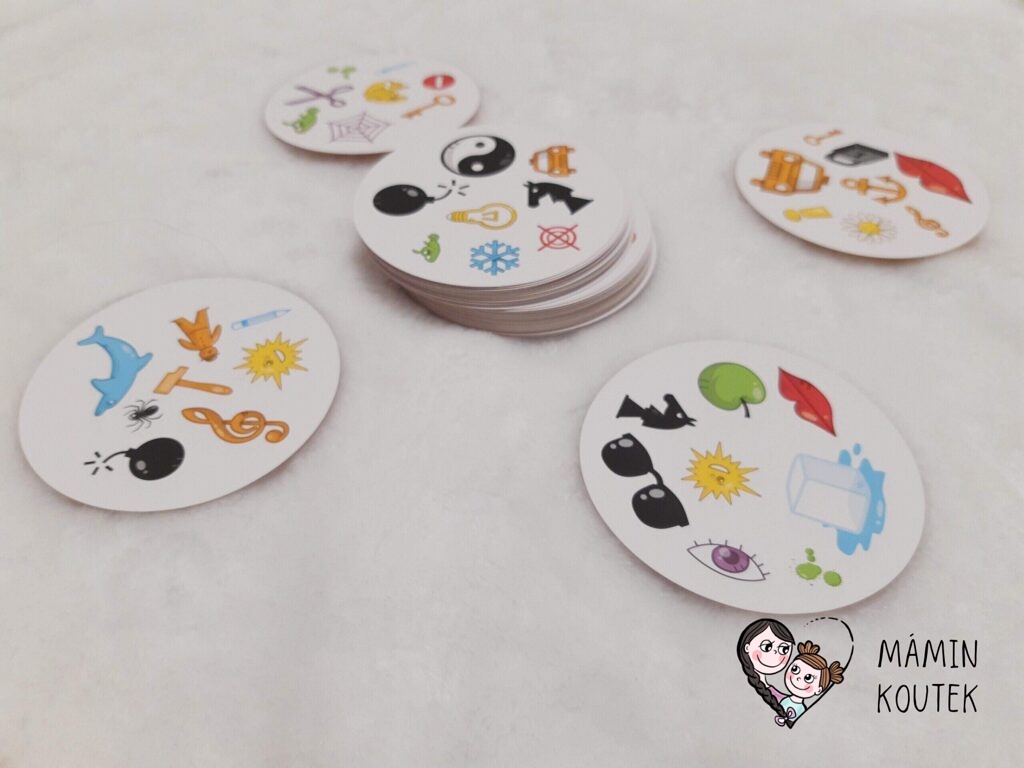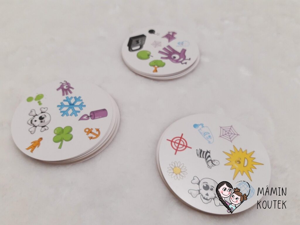 Na každé kartě najdete 8 různých obrázků (celkově je obrázků 50). A vždy na dvou kartách je právě jeden obrázek shodný. Ale pojďme se raději podívat na konkrétní hry.