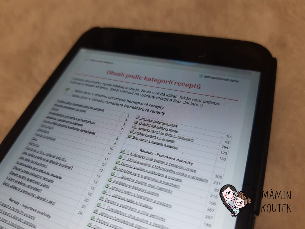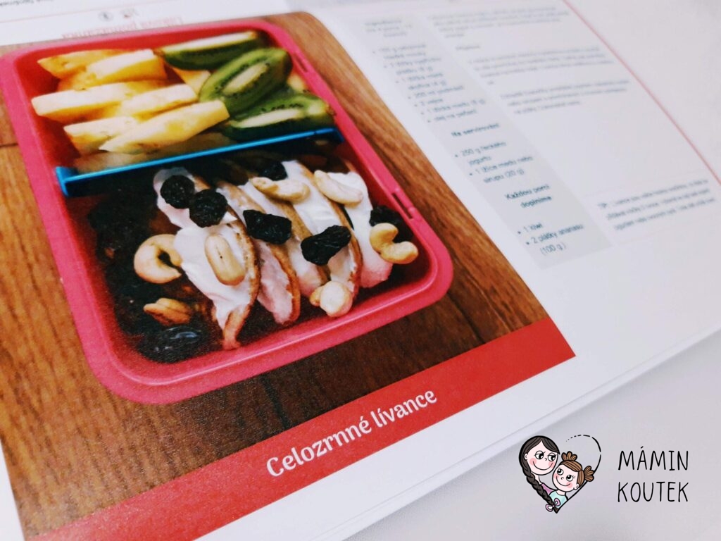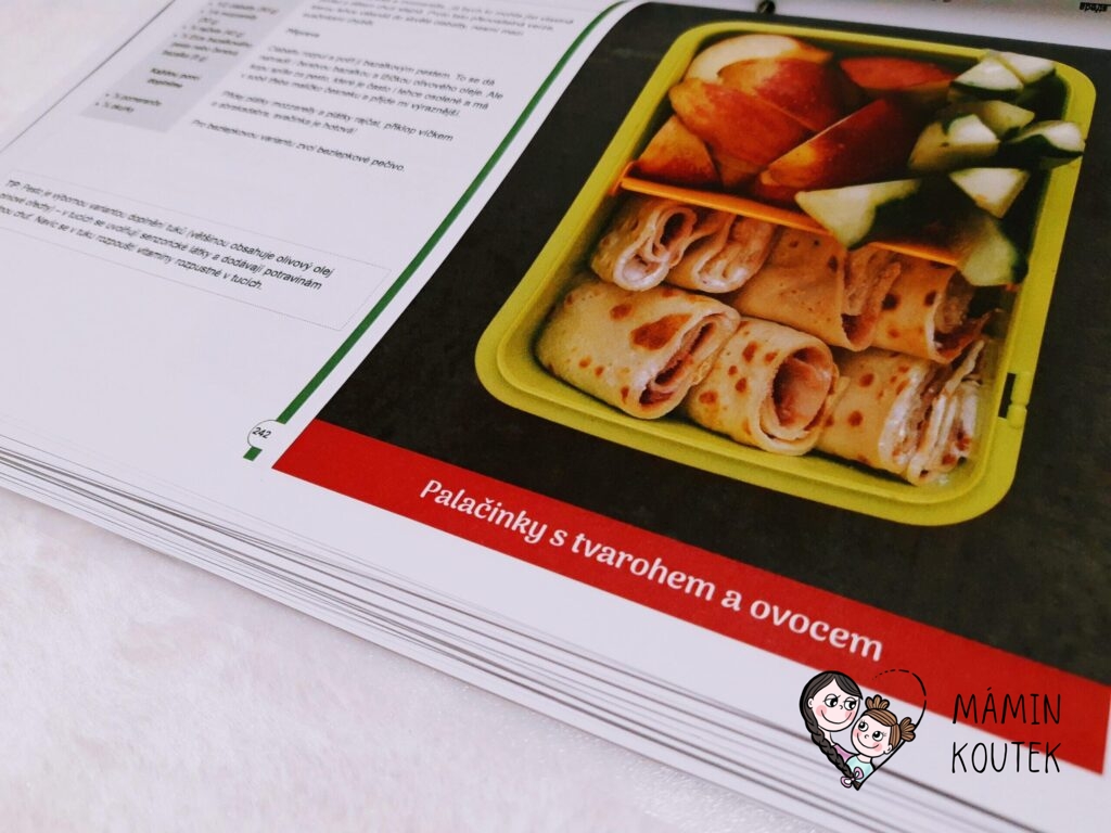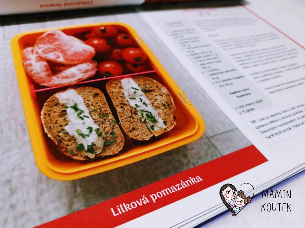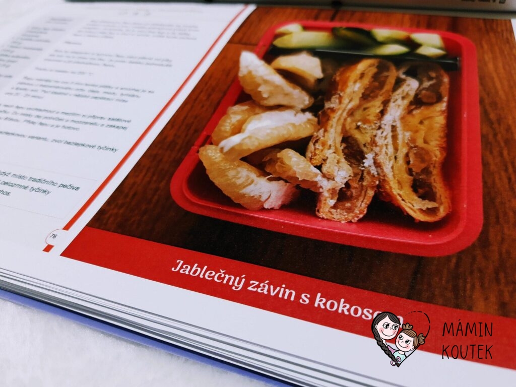 Pak už přicházejí na řadu recepty. V seznamu jsou rozděleny podle různých kategorií – jogurtové svačinky, pudinkové dobrůtky, netradiční mléčné mlsy, pomazánky, pečení sladké i slané, saláty, obložené svačinky a také různé speciality. V knize jsou pak recepty seřazeny už přímo jako týdenní plán. Ale je jen na vás, jestli se ho budete držet nebo využijete jen některé recepty. Tím, že se jedná o elektronickou knihu, tak se můžete z obsahu dostat jedním kliknutím přímo na jakýkoli recept.