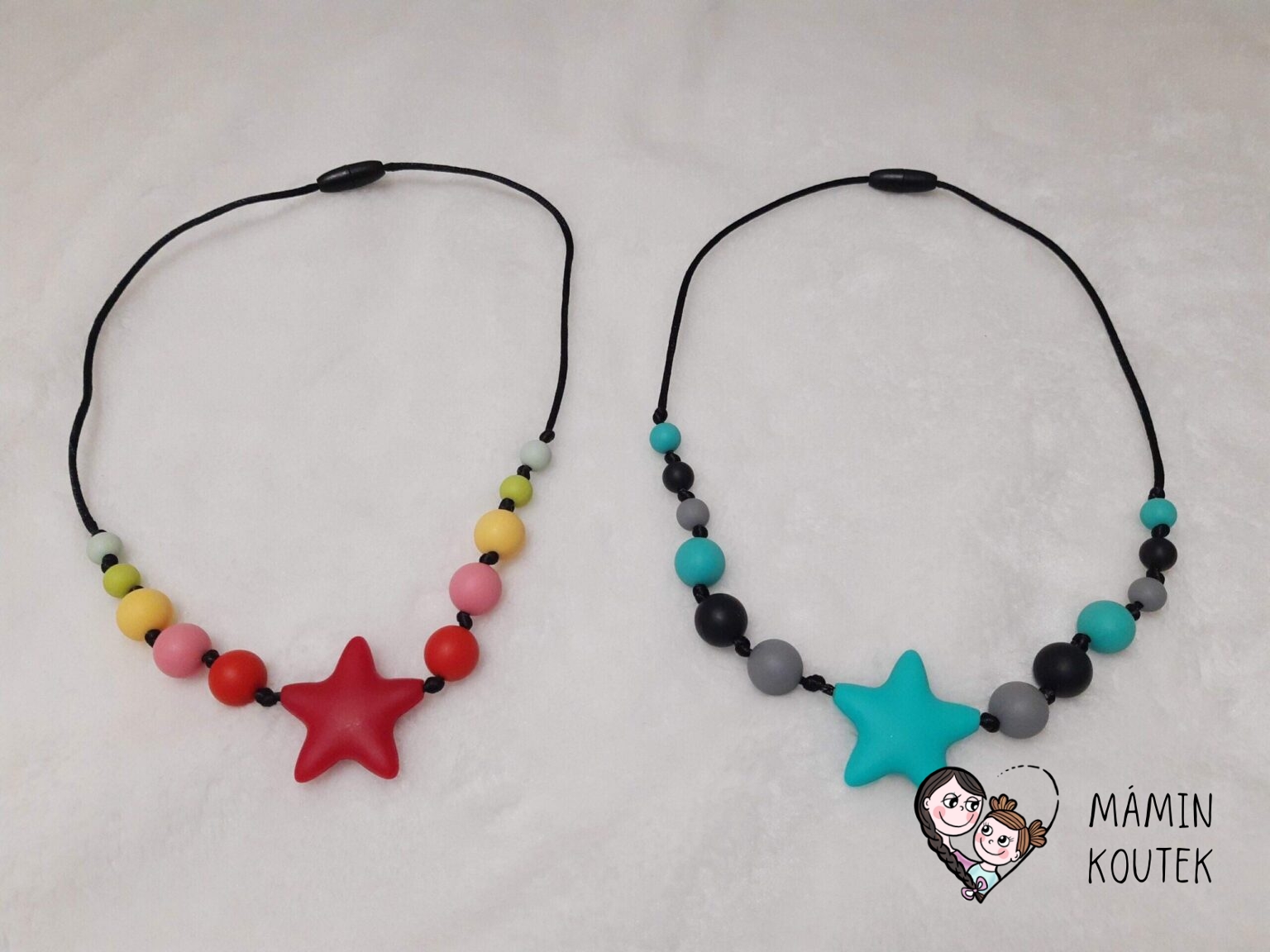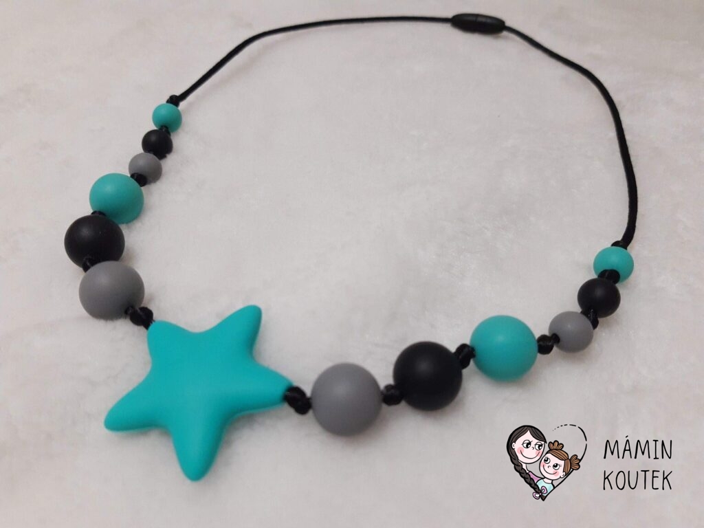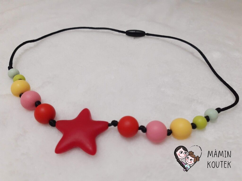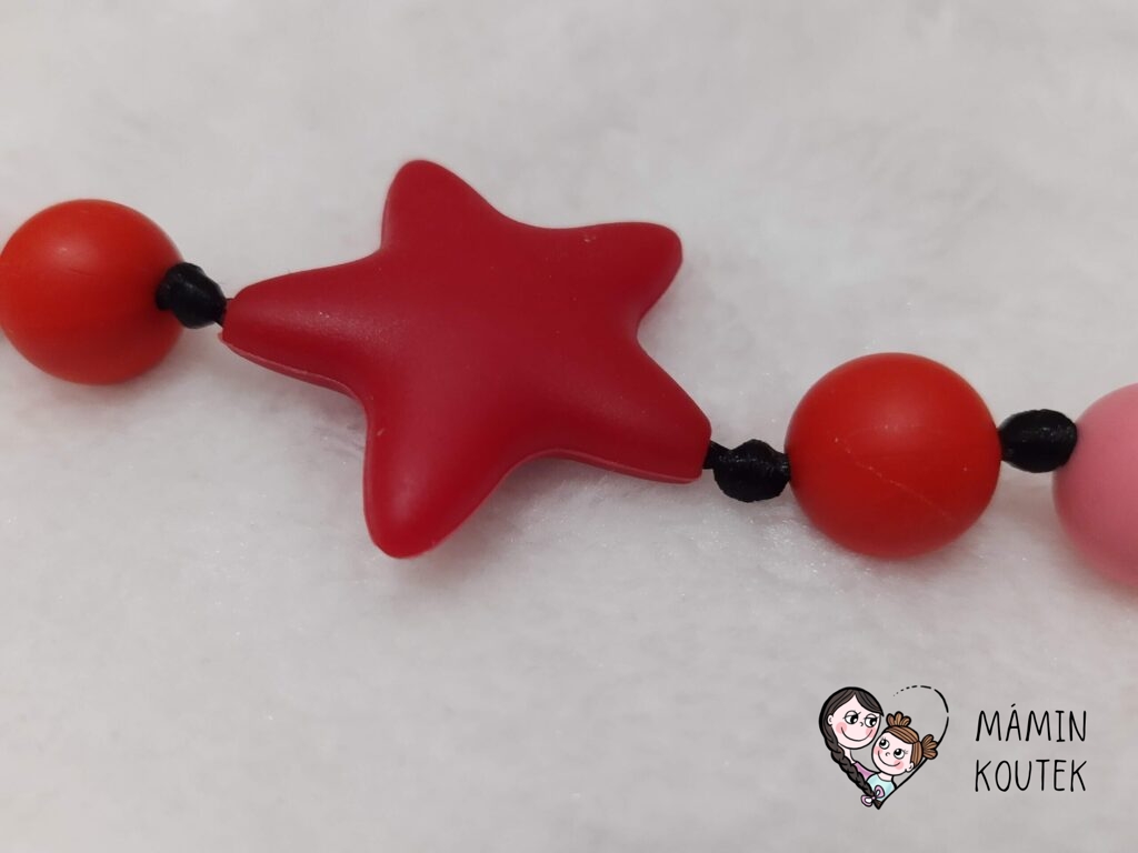 Hvězdičky – na kojící korále se mi hodně osvědčily. Beru většinou ty největší (45×45 mm). Vypadají dobře, náhrdelník ozvláštní a nejsou ani tak drahé. Můžete koupit pouze jednu barvu, mix nebo si sami určit, které barvy se vám líbí. Na Aliexpress je najdete pod označením Silicone Star Beads. Cena: 9 Kč/kus. Nejmenší množství pro odběr: 10 ks. Odkaz ke koupi třeba zde.