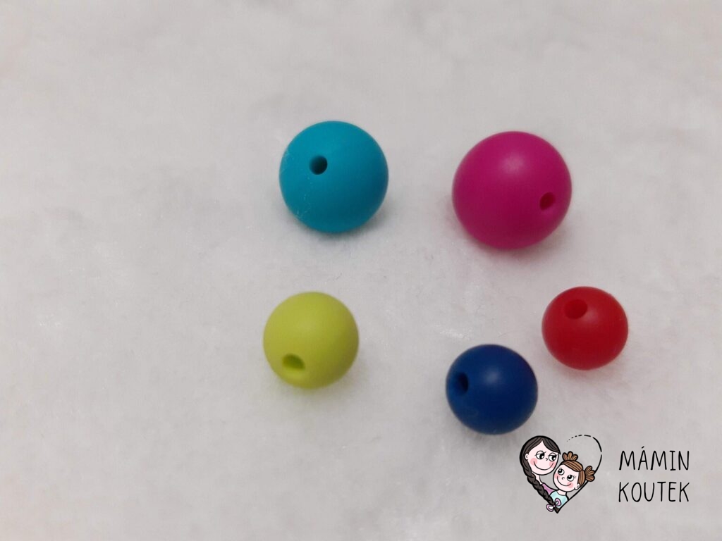 Kulaté korálky – beru nejčastěji průměr 9 mm a 15 mm. Ale v nabídce jsou i další. Můžete koupit pouze jednu barvu, mix nebo si sami určit, které barvy se vám líbí. Na Aliexpress je najdete pod označením Silicone Round Beads. Cena: 1-8 Kč/kus. Nejmenší množství pro odběr: 10 ks. Odkaz ke koupi třeba zde.