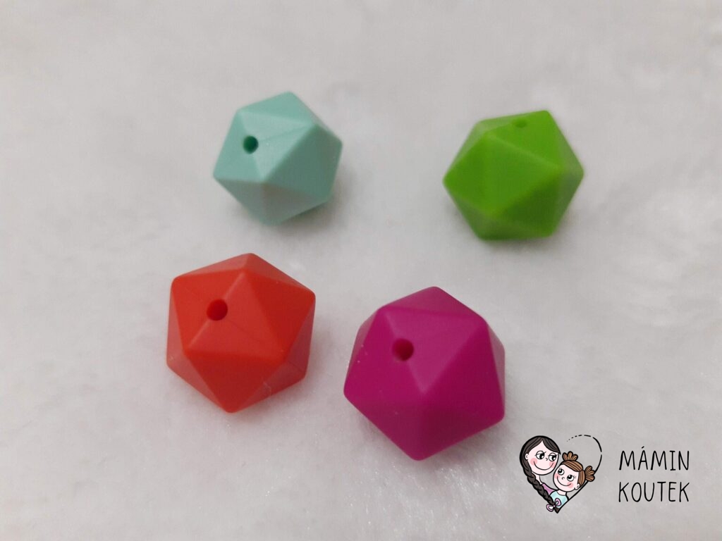 Hranaté korálky – kupuji průměr 14 mm, ale dá se pořídit i 17 mm. Můžete koupit pouze jednu barvu, mix nebo si sami určit, které barvy se vám líbí. Na Aliexpress je najdete pod označením Silicone Hexagon Beads. Cena: 4-6 Kč/kus. Nejmenší množství pro odběr: 10 ks. Odkaz ke koupi třeba zde.