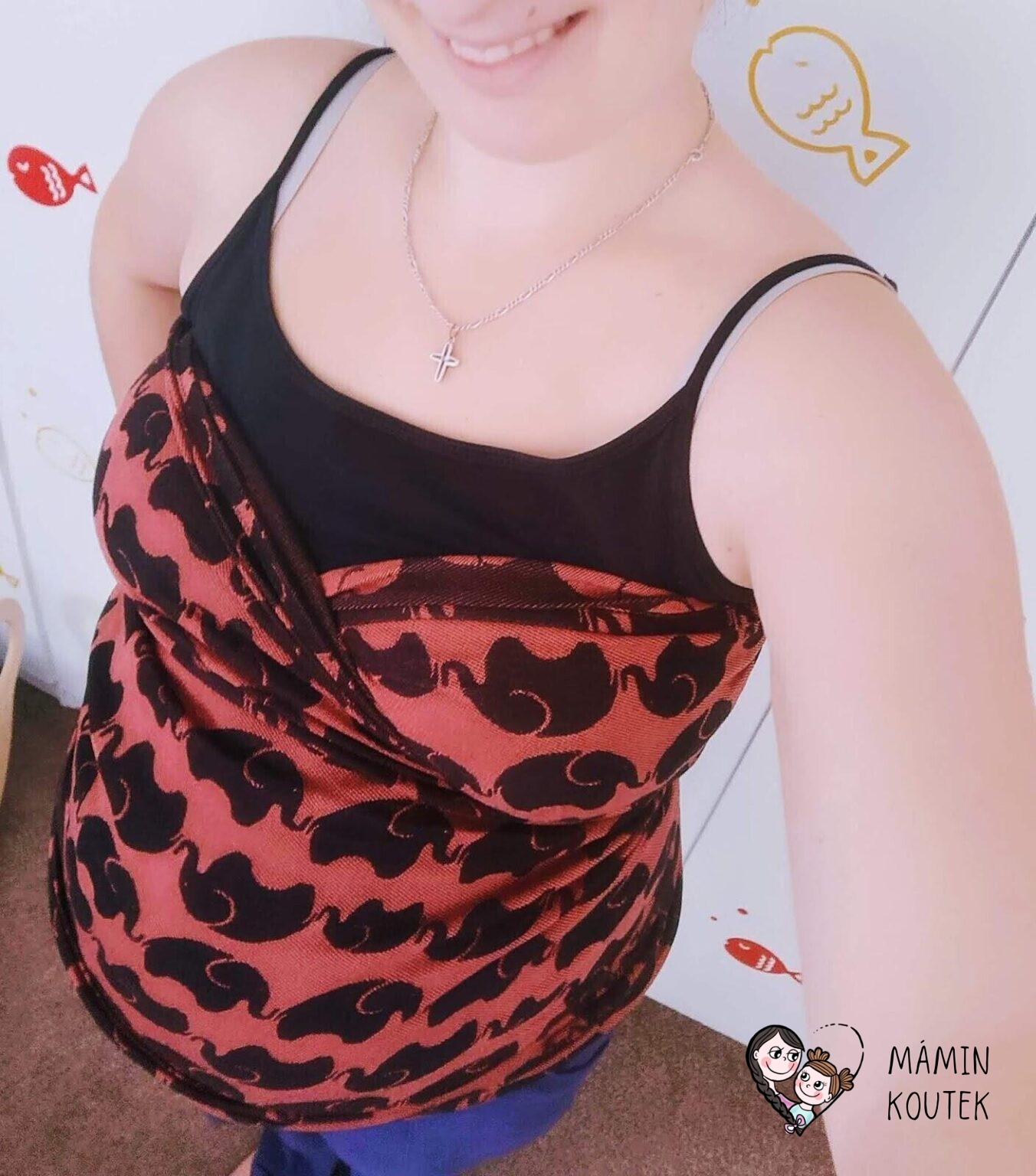 Při druhém těhotenství se ale začaly celkem brzo objevovat problémy se zády a bedry, takže jsem se rozhodla vyzkoušet také vázání bříška. A musím říct, že jsem nadšená. Třetí trimestr si už bez šátku nedovedu ani představit.