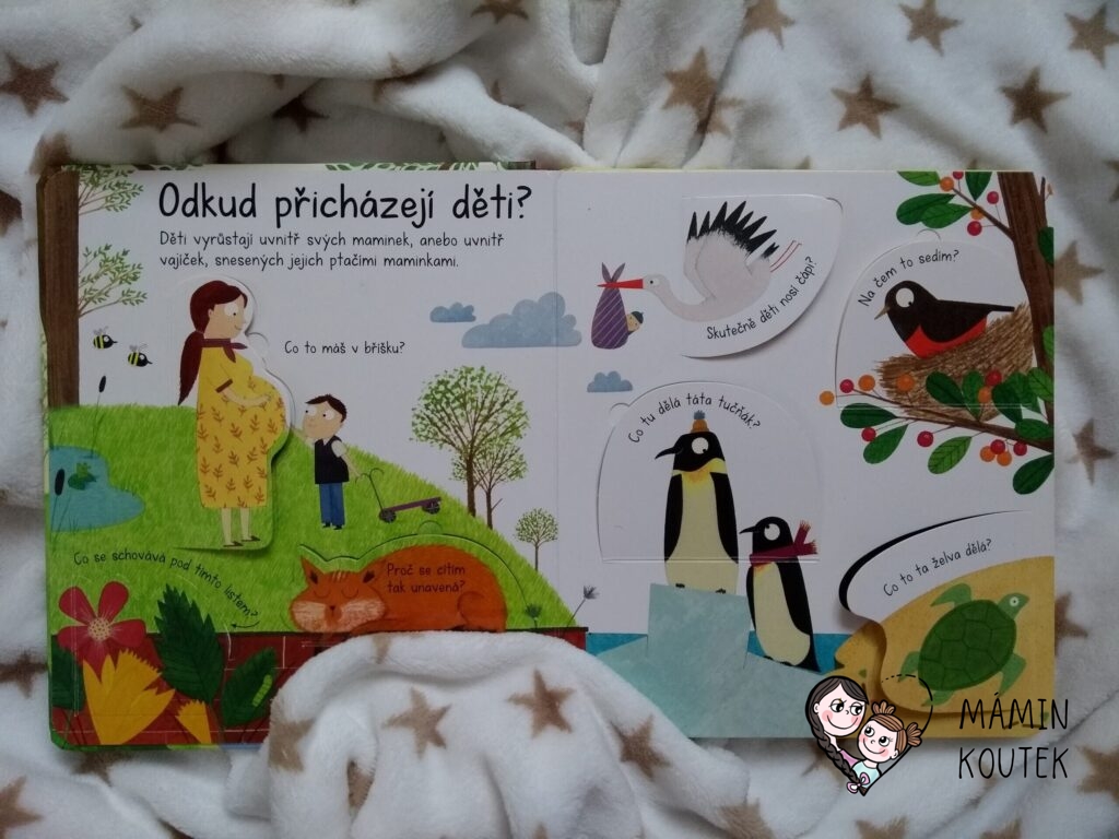Okénková knížka, kde se čtenáři dozvědí, jak vlastně děti přicházejí na svět. A to nejen lidské miminka, ale také malá zvířátka. Jak vznikne miminko? Kdy se narodí? Jak děti rostou a čím budou, až vyrostou? Na všechny tyto otázka se snaží knížka zodpovědět, a to na základě konkrétních příkladů. Doporučuji cca od 3 let.