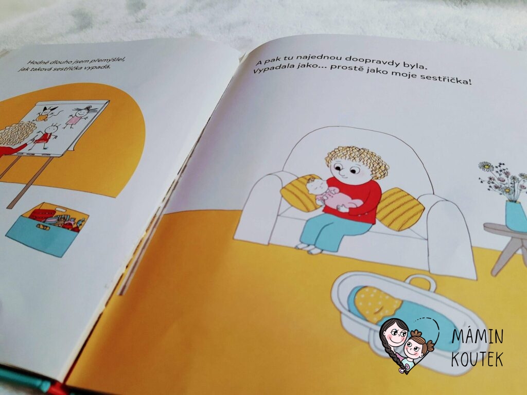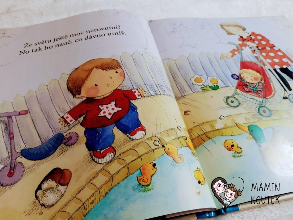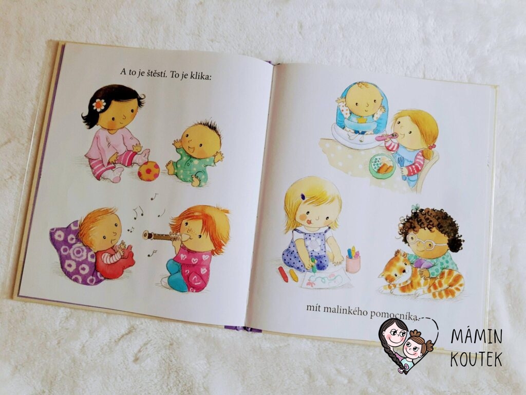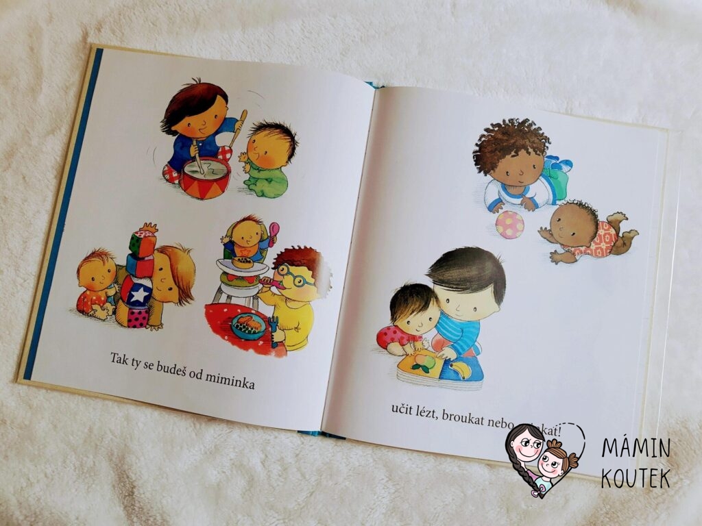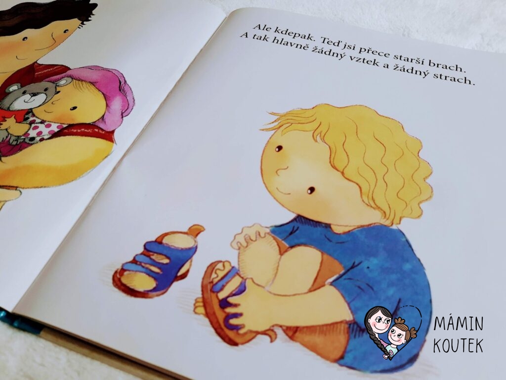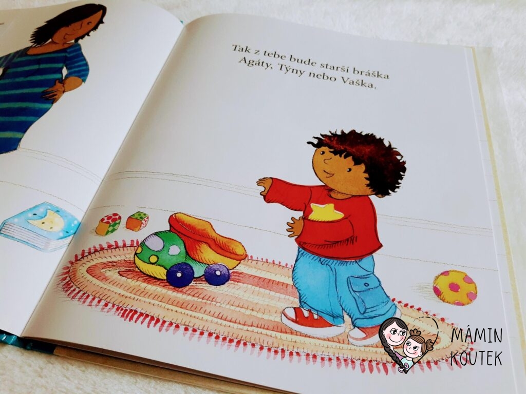 Knížka se snaží dětem přiblížit, jak se změní jejich život s příchodem sourozence. Zaměřuje se především na to, co může bráška se sourozencem dělat, jak se bude asi miminko chovat, co ho může naučit a podobně. Kniha je navíc doprovázena o krátké texty (většinou 1-2 věty na celou dvojstránku). Doporučuji cca od 2 let.