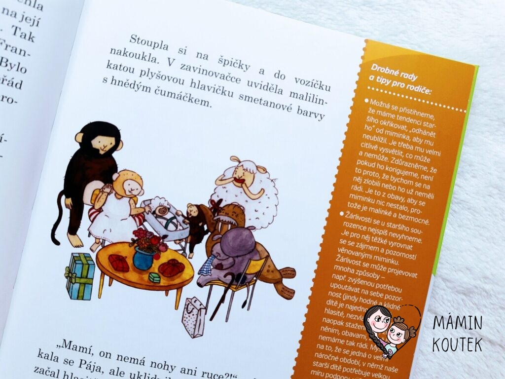 V této knížce se autorka zabývá především sourozeneckými vztahy. Krásně, mile a stručně ukazuje, jak vypadá čekání na sourozence a následný život s ním. Vše doplněno o jednoduché obrázky. Kniha je psána očima malého chlapečka Adámka, ale klidně ji mohou číst i holky. Určitě všem rodičům doporučuji, protože je zde krásně vidět, že i když nový sourozenec vezme trošku pozornosti, stále je důvod, proč ho mít rád. A že rodičovská láska nepřechází na další dítě, ale dělí se a násobí.