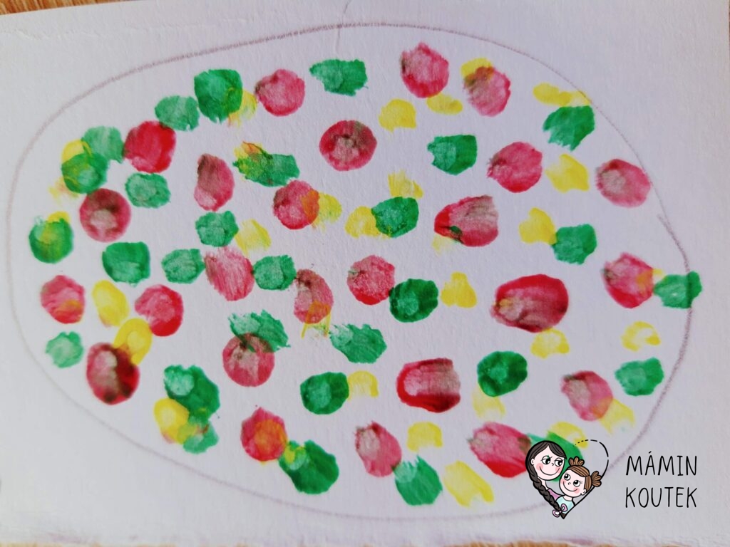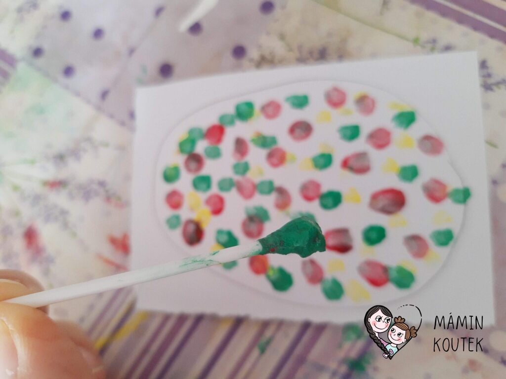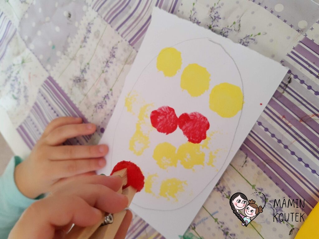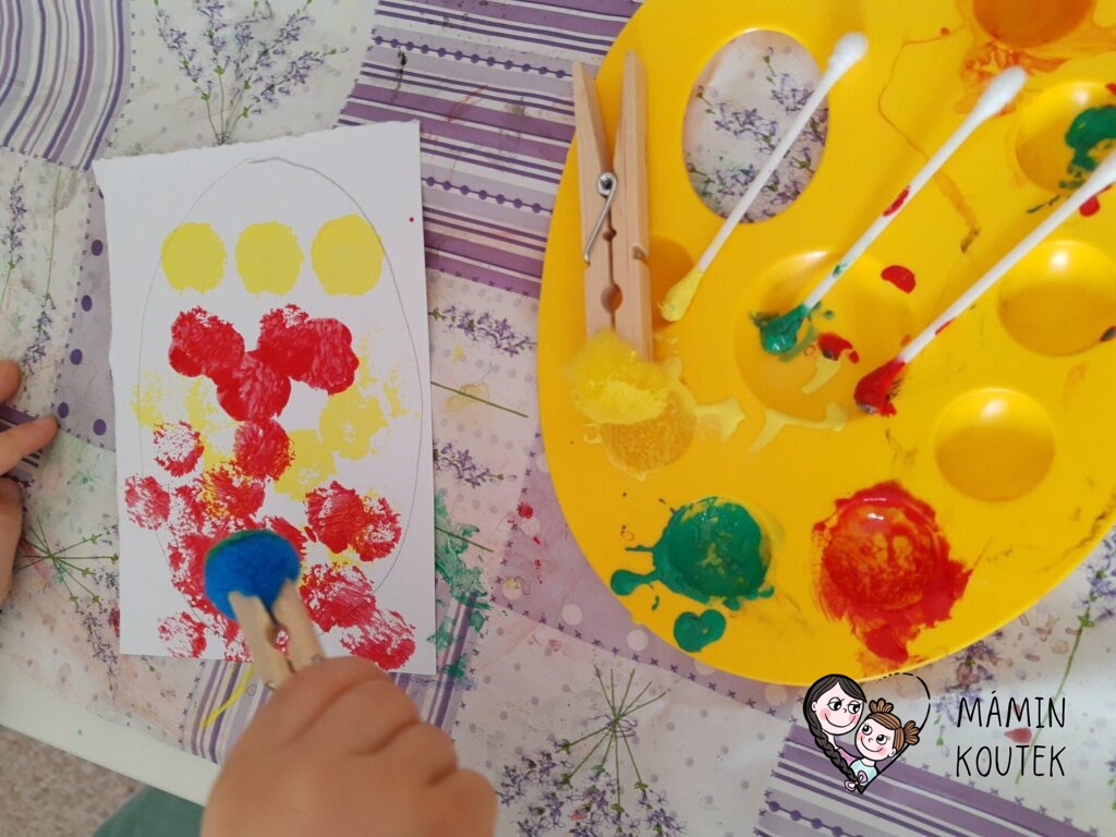 3. Vezmeme vatové tyčinky, namočíme do barvy a děláme dle uvážení různé tečky. Na každou barvu doporučuji novou vatovou tyčinku. Tečky jsou malé, takže doporučuji i menší plochu na tisknutí. My jsme měli třeba papír formátu A6 a na něm nakreslené vajíčko.