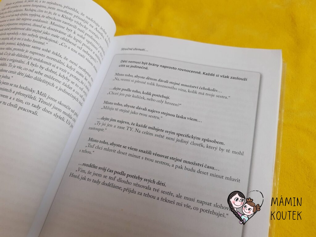 V knize Sourozenci bez rivality sice nenajdete tolik prostoru a otázek, na které si máte sami odpovědět (jak to bylo u první knihy). Na druhou stranu je zde opravdu hodně situací ze života, ve kterých se možná poznáte. Kniha přitom nemá za cíl vám nadiktovat postup, jak se chovat. V podstatě v ní ani nenajdete nějaké dlouhé návody, jak s dětmi jednat. Zjistíte ale, jak mohou děti sourozence vnímat a co může některé jednání způsobit. Kniha se vám tedy snaží hlavně pomoci děti pochopit. Protože pokud porozumíte jejich obavám, chování a myšlenkám, budete schopni lépe a spravedlivěji reagovat.