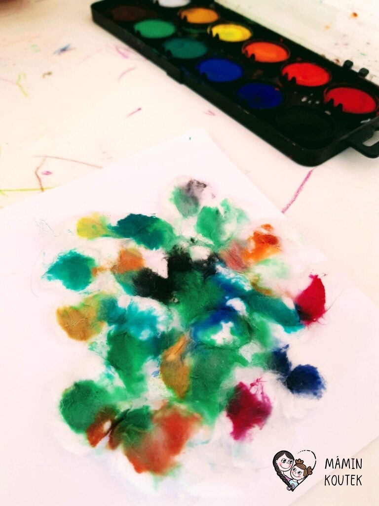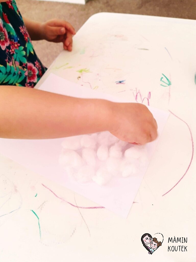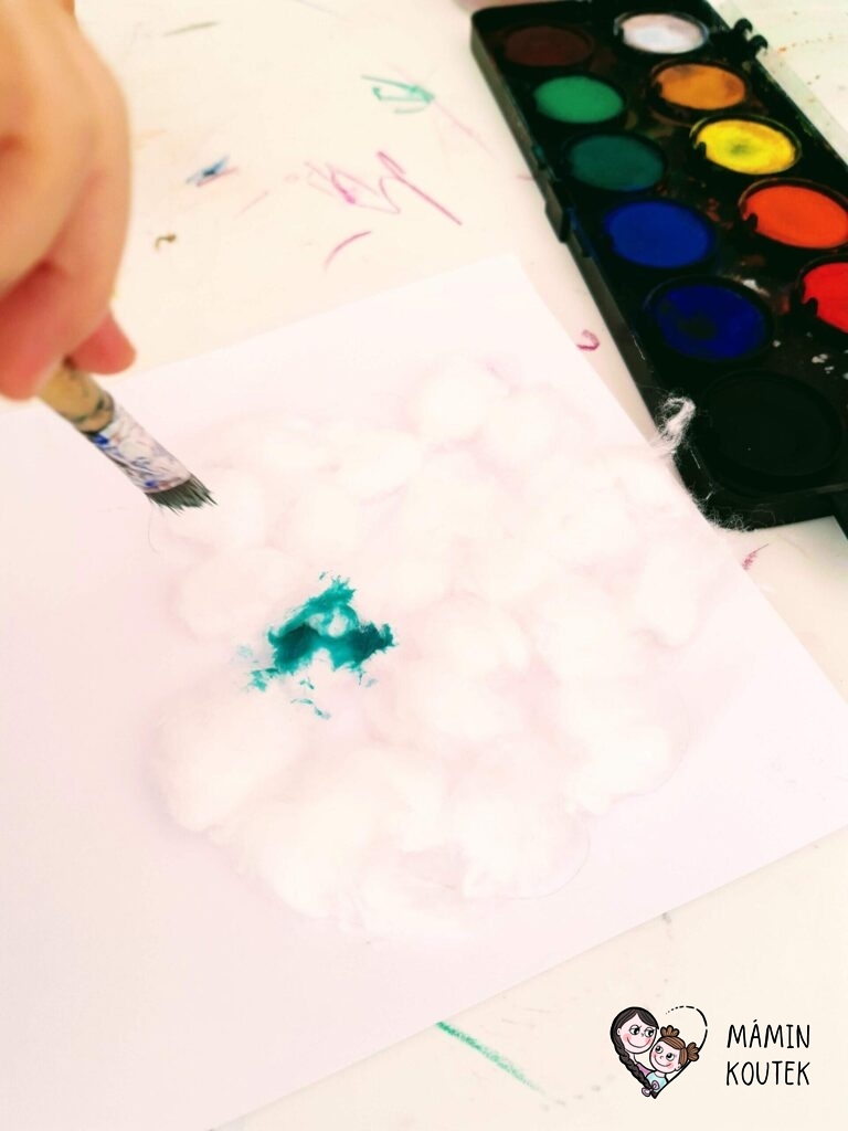 Další naše poznávání materiálů na tvoření nás zavedlo k vatě. S vatou už jsme několikrát pracovali, především při lepení nebo jako výplň. Nyní jsme se ale zaměřili na obarvování vaty vodovými barvami.