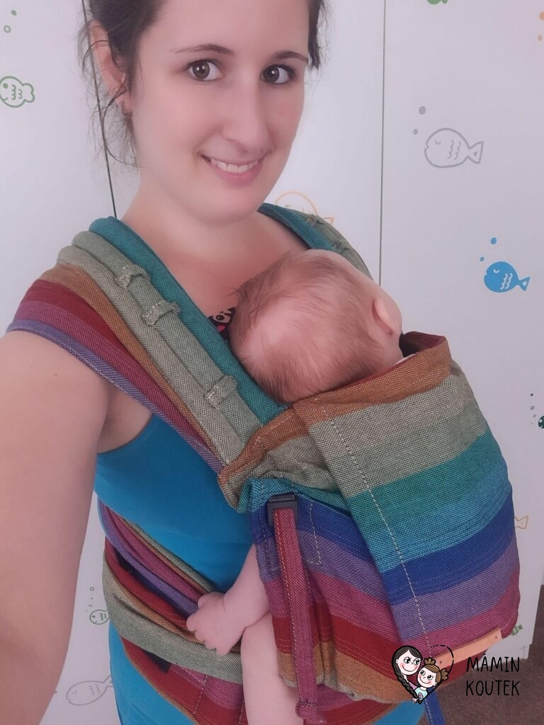 Při vázání popruhů jsem potřebovala dva uzly, na jednom se nosítko povolovalo. Také upevnění kapuce by mohlo být lepší – osobně mám raději rychle zacvaknutí nebo pověšení, než vázání. Jinak ale bylo nosítko příjemné, váha se hezky rozložila. A i když je Naty drobná, sedělo krásně.