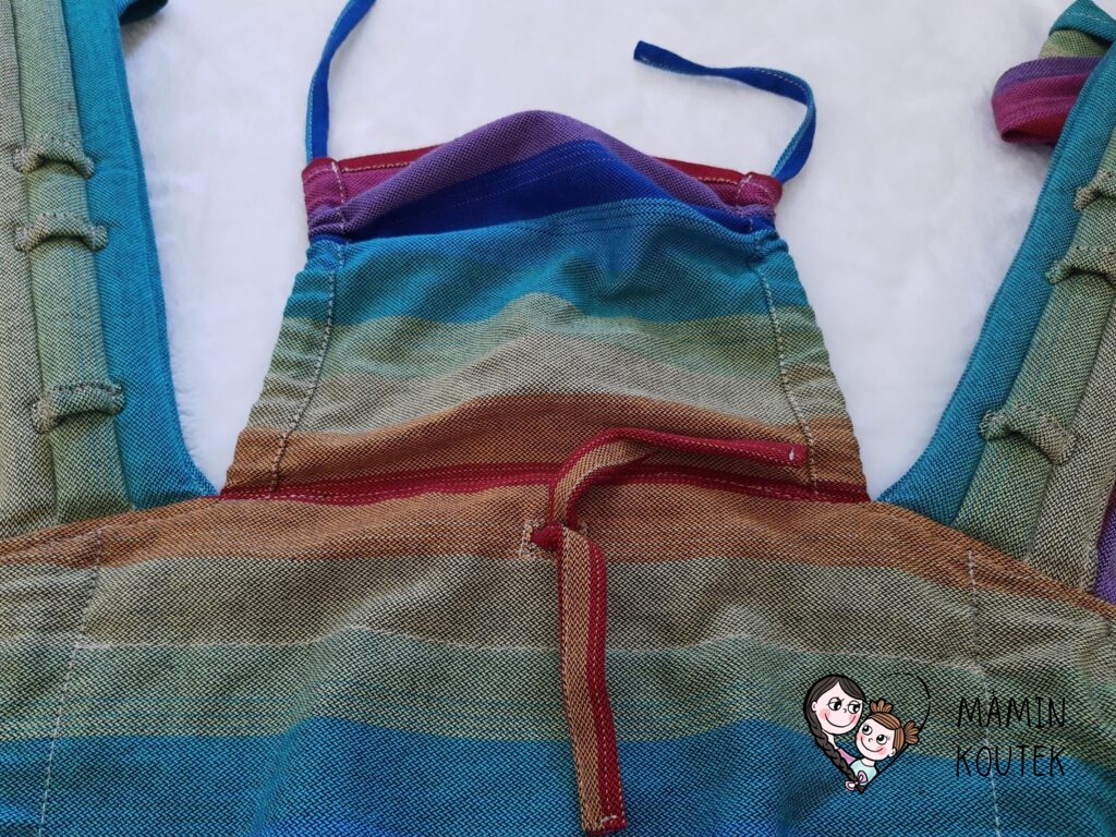 U nosítka nechybí kapuce. Jedná se o pevně všitý pruh látky, který se dá na boku stáhnout. Konec pak lze přivázat na ramenní popruhy do různé výšky.