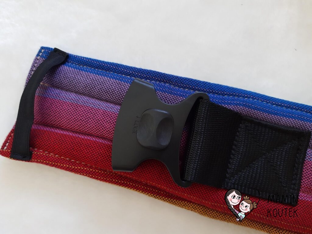 Šírka sedu na předním díle se stahuje pomocí šňůrek na zavazování. Nosítko se pak okolo pasu zapíná na plastovou sponku, což je podobné jako u jiných nosítek. Na sponě nechybí ani pojistka, aby se nosítko samo nerozeplo.