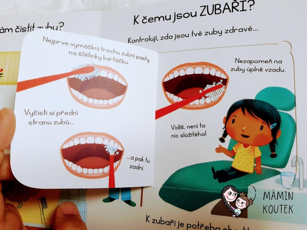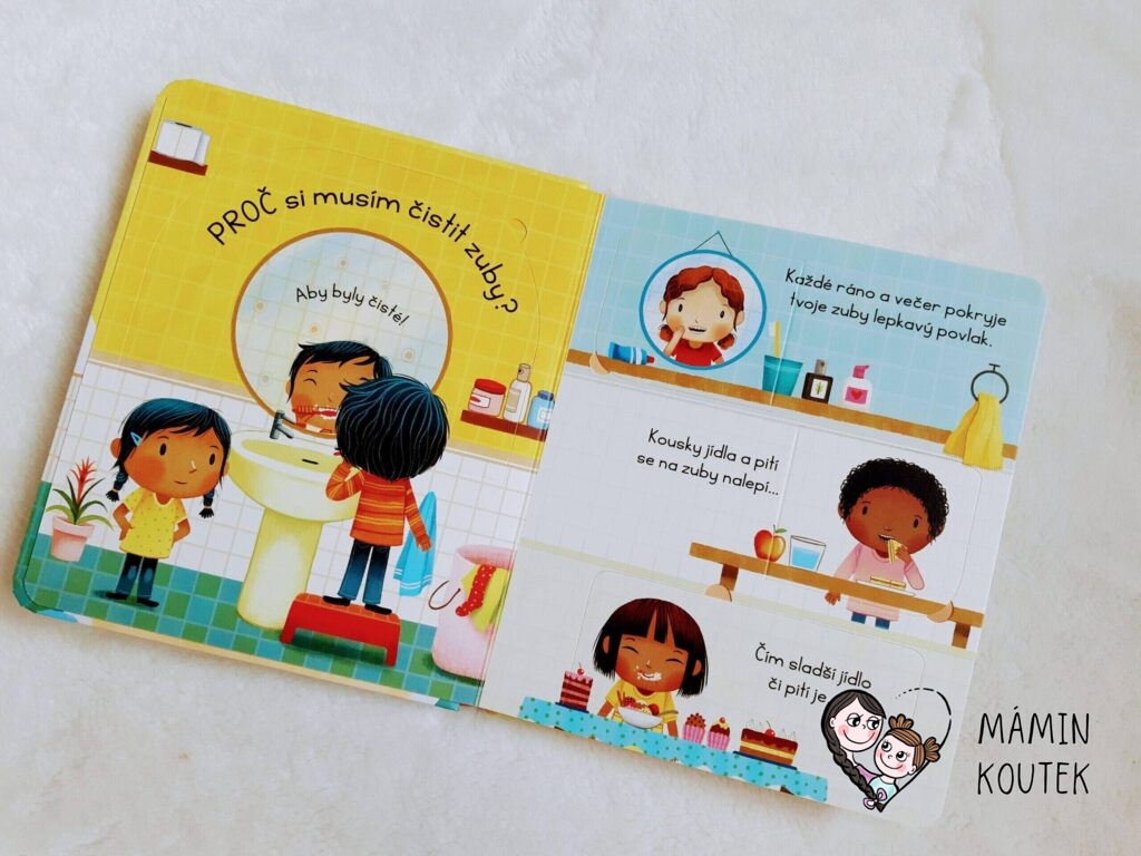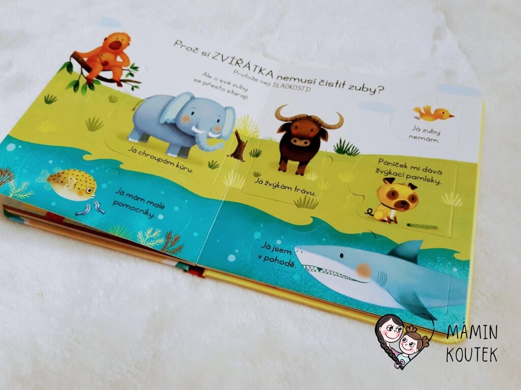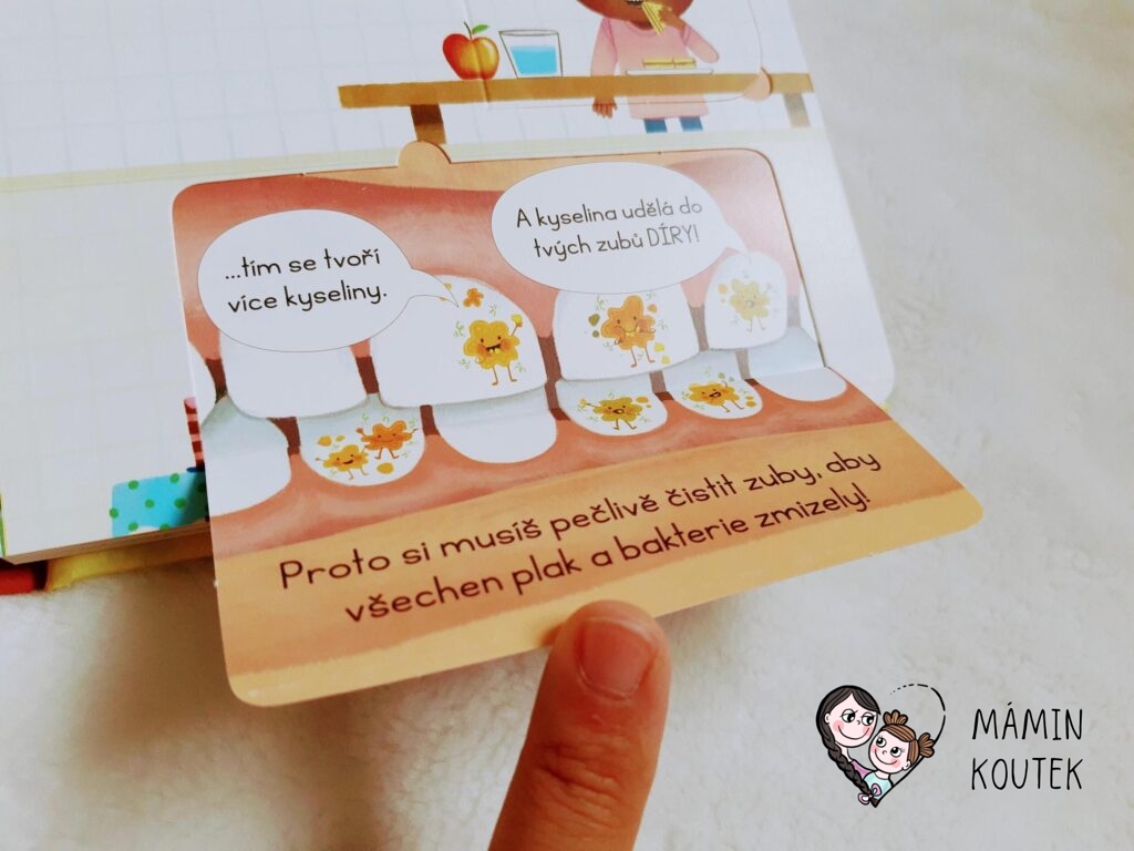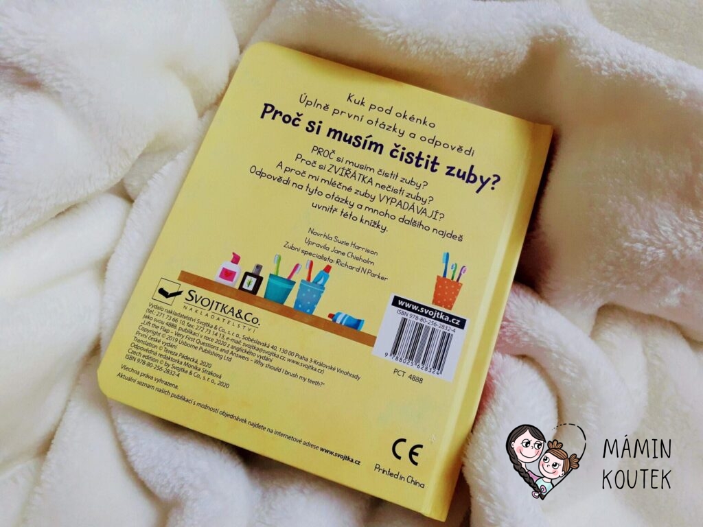 Rozhodli jsme se proto vyzkoušet novinku od Nakladatelství Svojtka – knihu Proč si musím čistit zuby. Knížka obsahuje spoustu okének, kde se děti dozví, proč je dobré si zuby každý den čistit. Hodí se proto skvěle pro zvědavce, ale i pro ty, kteří potřebují do čištění zoubků trošku popostrčit a namotivovat.