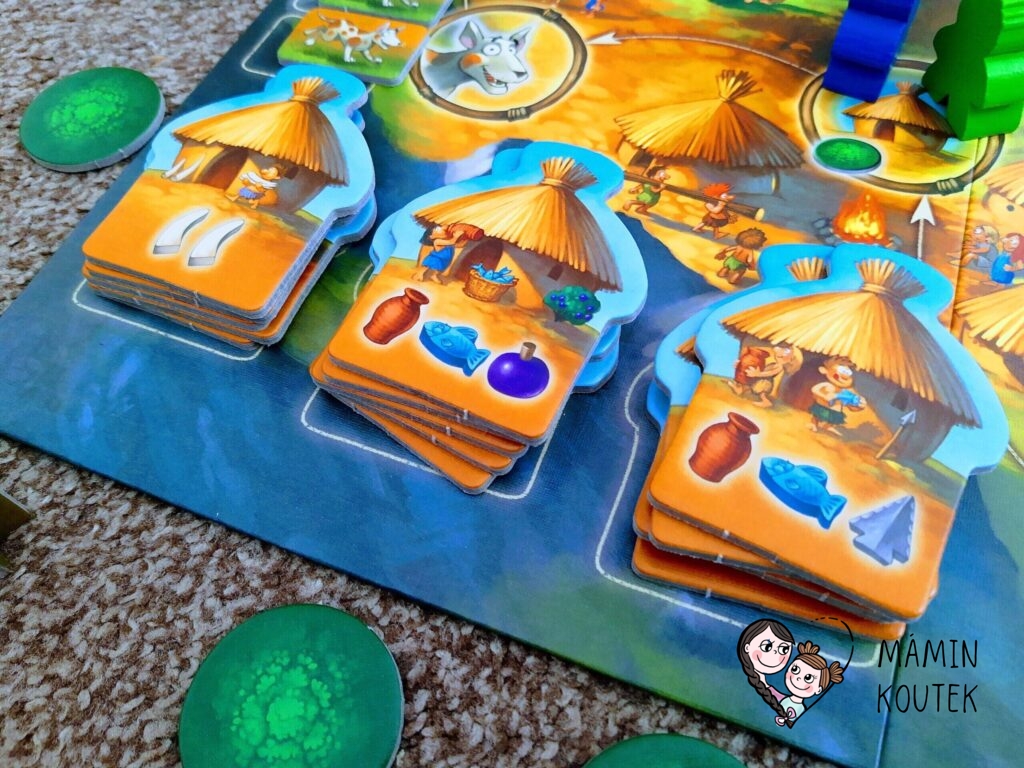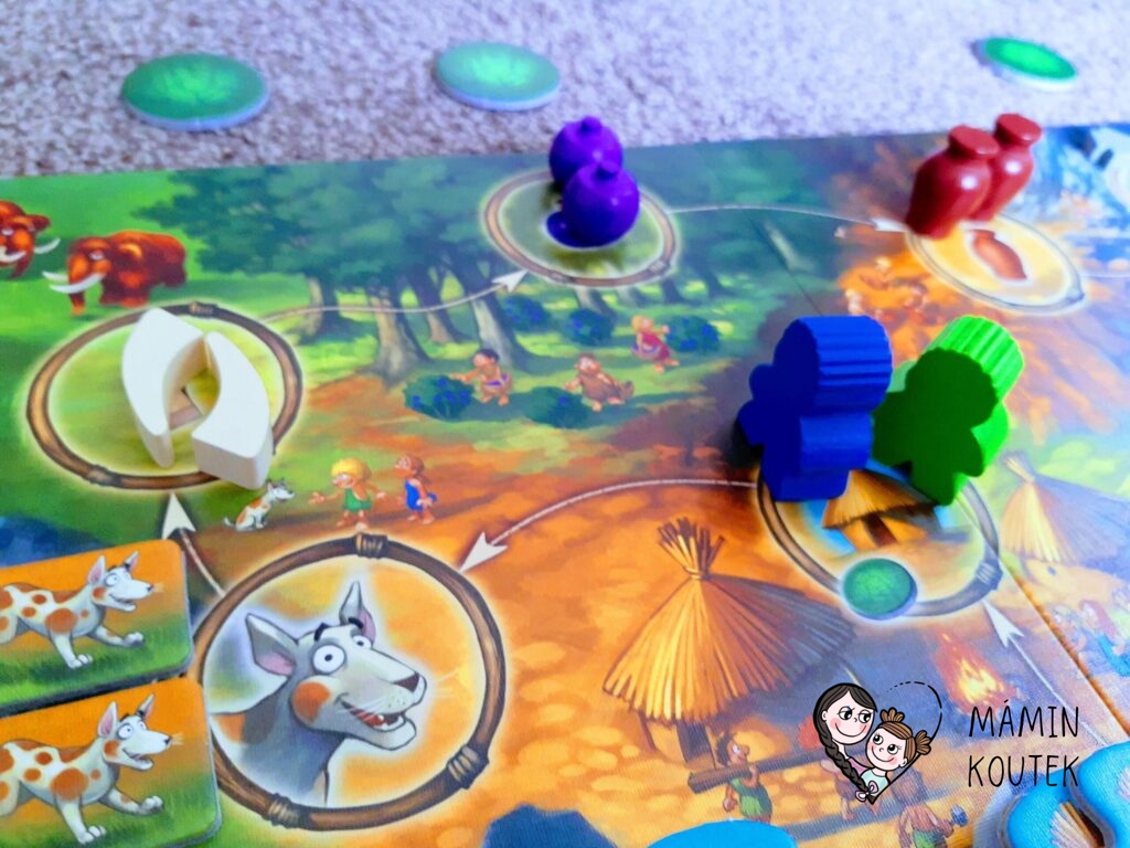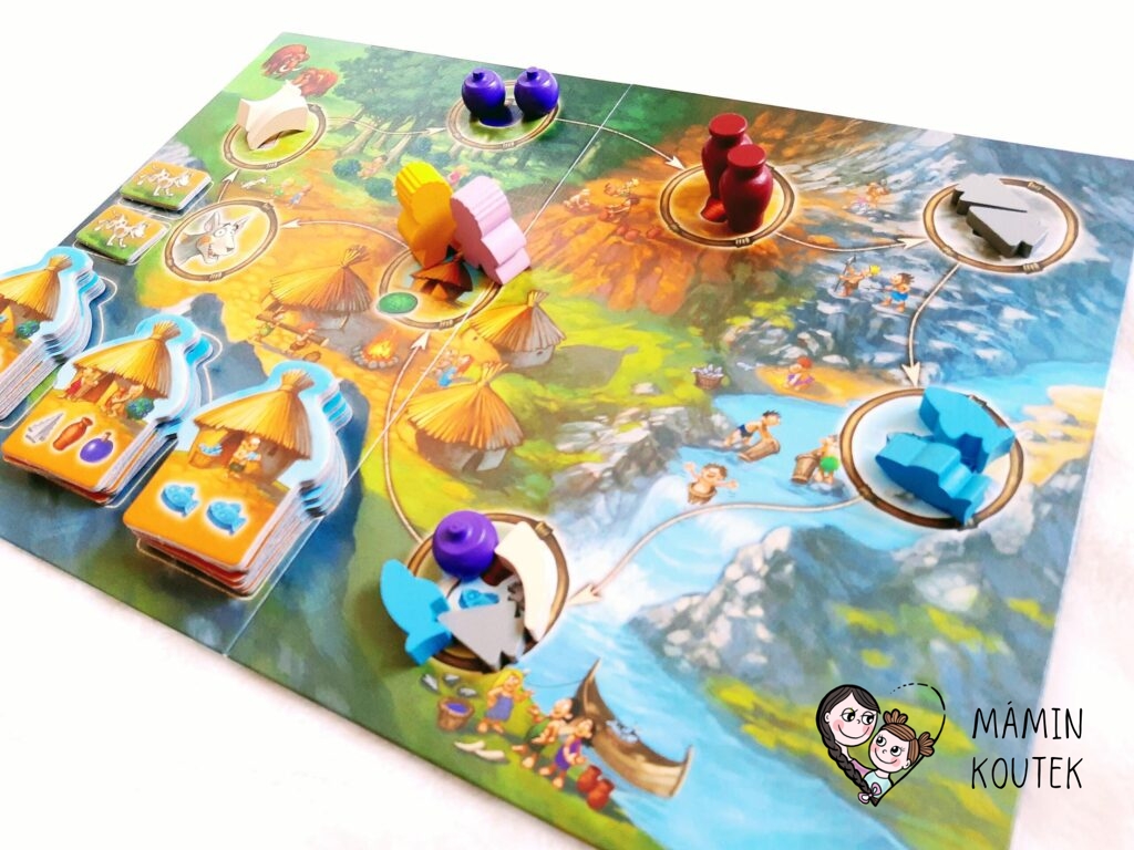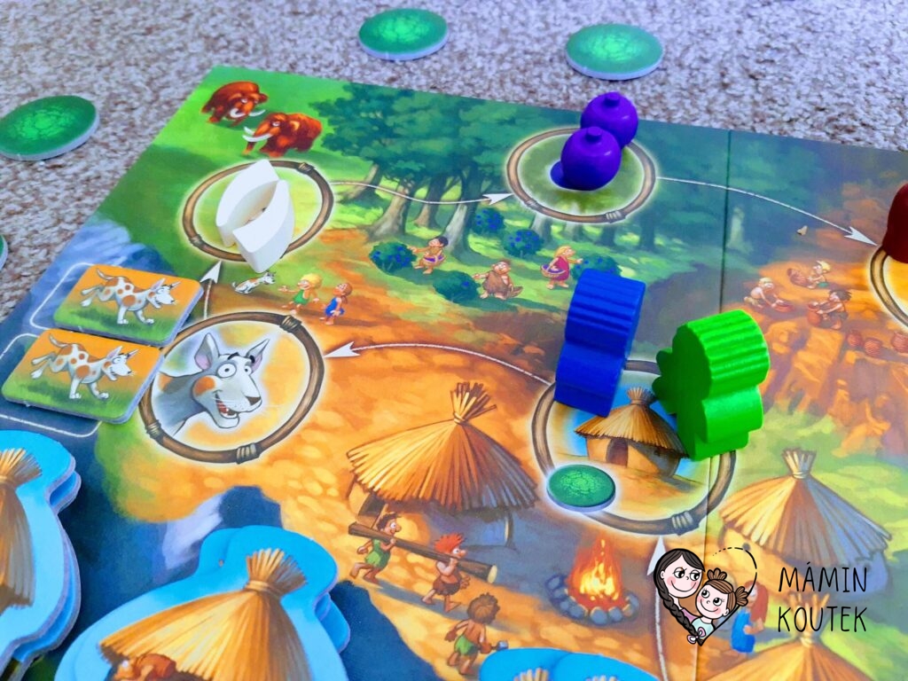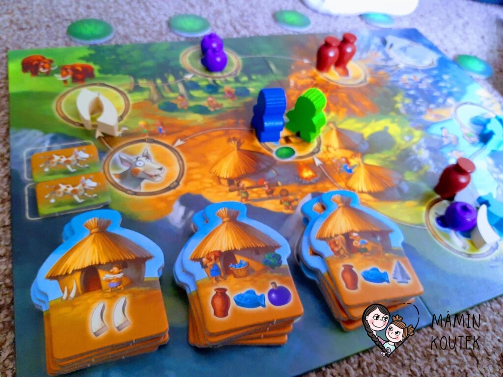 1. Prvně je nutné nachystat hru – každý hráč si vezme jednu figurku a v té barvě také vesnici a žeton mamuta. Na hrací plán postavíte jednotlivé suroviny, kartičky chýší a žetony psů. Okolo hrací desky pak umístíte žetony lesa.