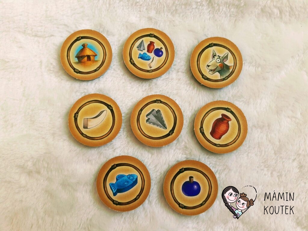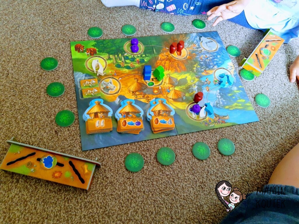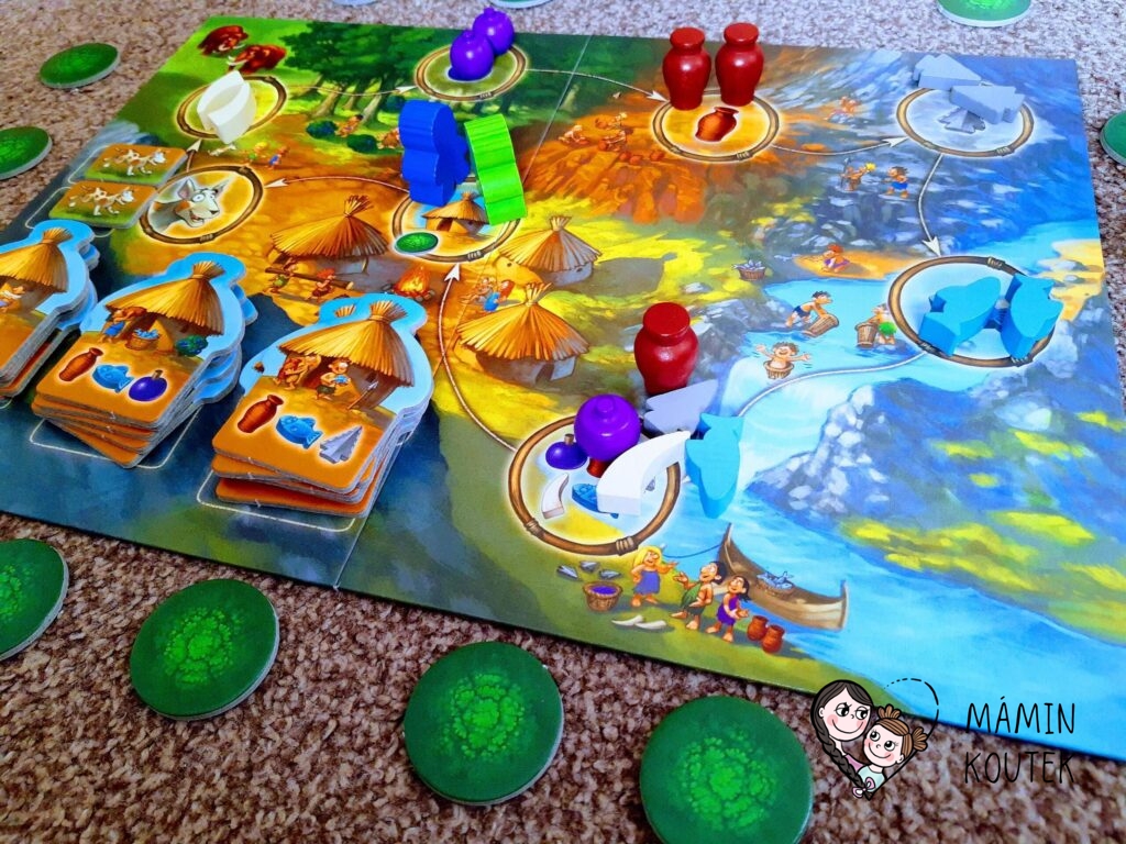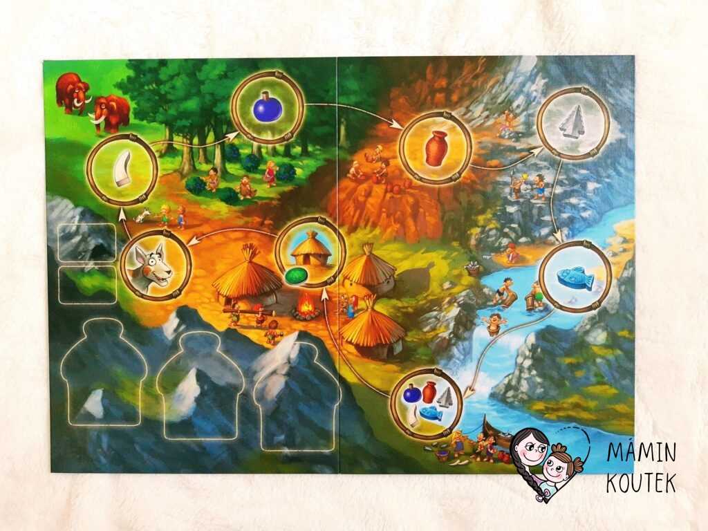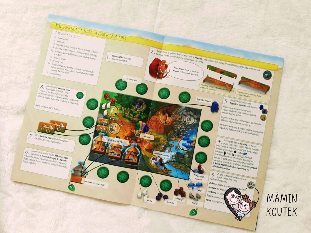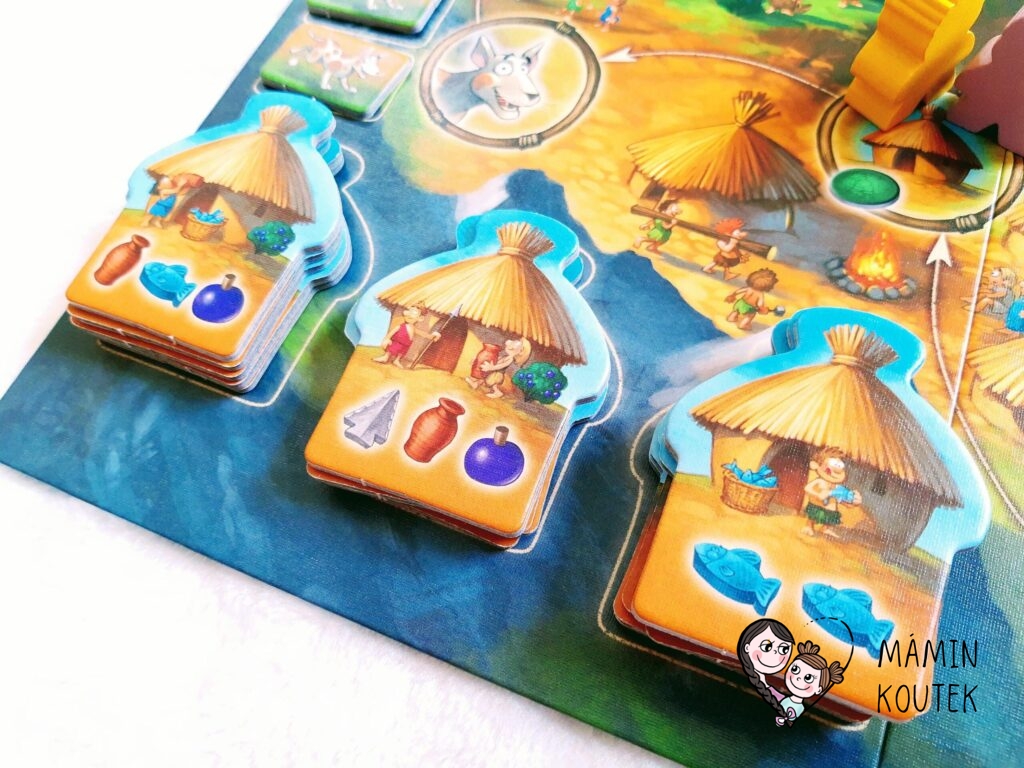 1. Prvně je nutné nachystat hru – každý hráč si vezme jednu figurku a v té barvě také vesnici a žeton mamuta. Na hrací plán postavíte jednotlivé suroviny, kartičky chýší a žetony psů. Okolo hrací desky pak umístíte žetony lesa.