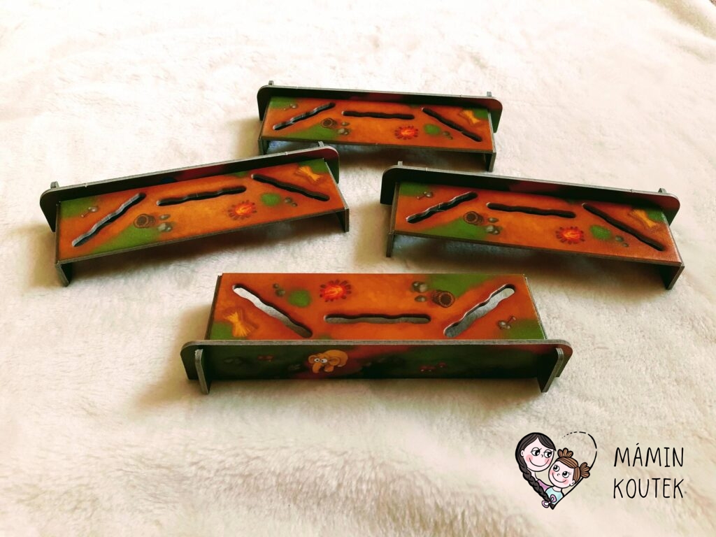 Herní deska není nijak velká, takže se klidně vleze i na menší stůl. Je z tvrdého kartonu a pokládají se na ni figurky hráčů, makety surovin, kartičky chýší a žetony psů.