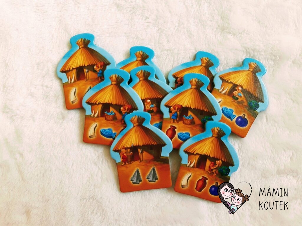 Hra obsahuje také 15 kartiček chýší, které se umisťují na hrací plochu. Pokud chýši hráč zaplatí, může si jí dát do své vesnice.