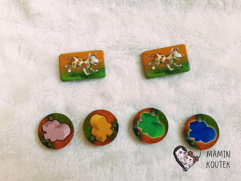 Posledními žetony jsou pak kartičky psů, které se umisťují na hrací plochu.