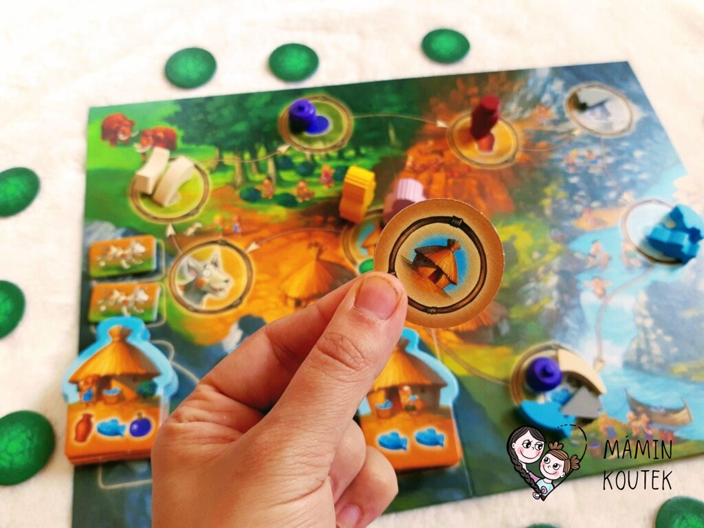- pes – vezmete si 1 žeton psa a položíte ho vedle své vesnice (pokud není žádný volný, vezmete ho soupeři). Žeton pomáhá při stavění chýše – může se použít místo 1 suroviny, pokud vám chybí.