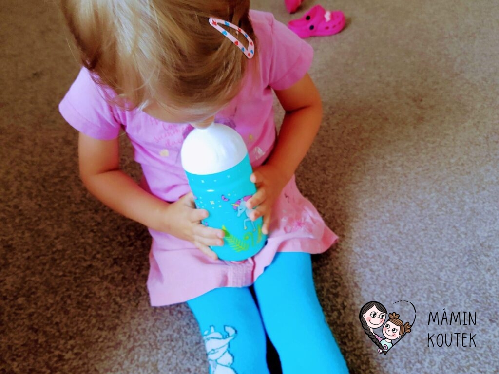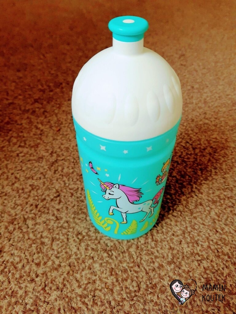 My jsme zvolili velikost 0,5 l, ale dělá se také větší (0,7 l nebo 1l). Na výběr je spousta motivů, a to jak holčičích, klučičích, tak i neutrálních. U nás si Beky vybrala sama, takže máme jednorožce a víly.