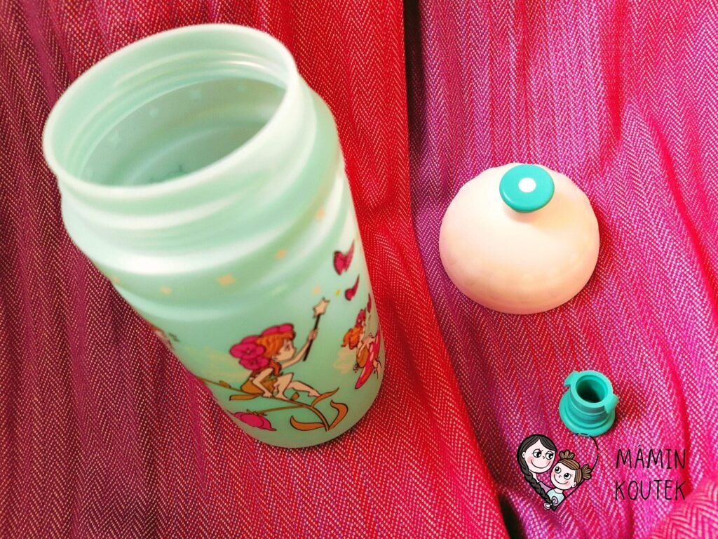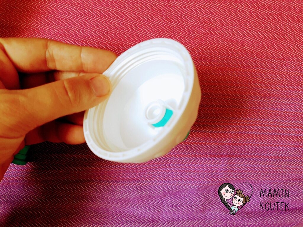 Láhev má široké hrdlo, takže se dobře plní. Na víčku je zátka, která se dá kdykoli oddělat. Pokud by byla moc špinavá, v krabičce byla dokonce 1 navíc.