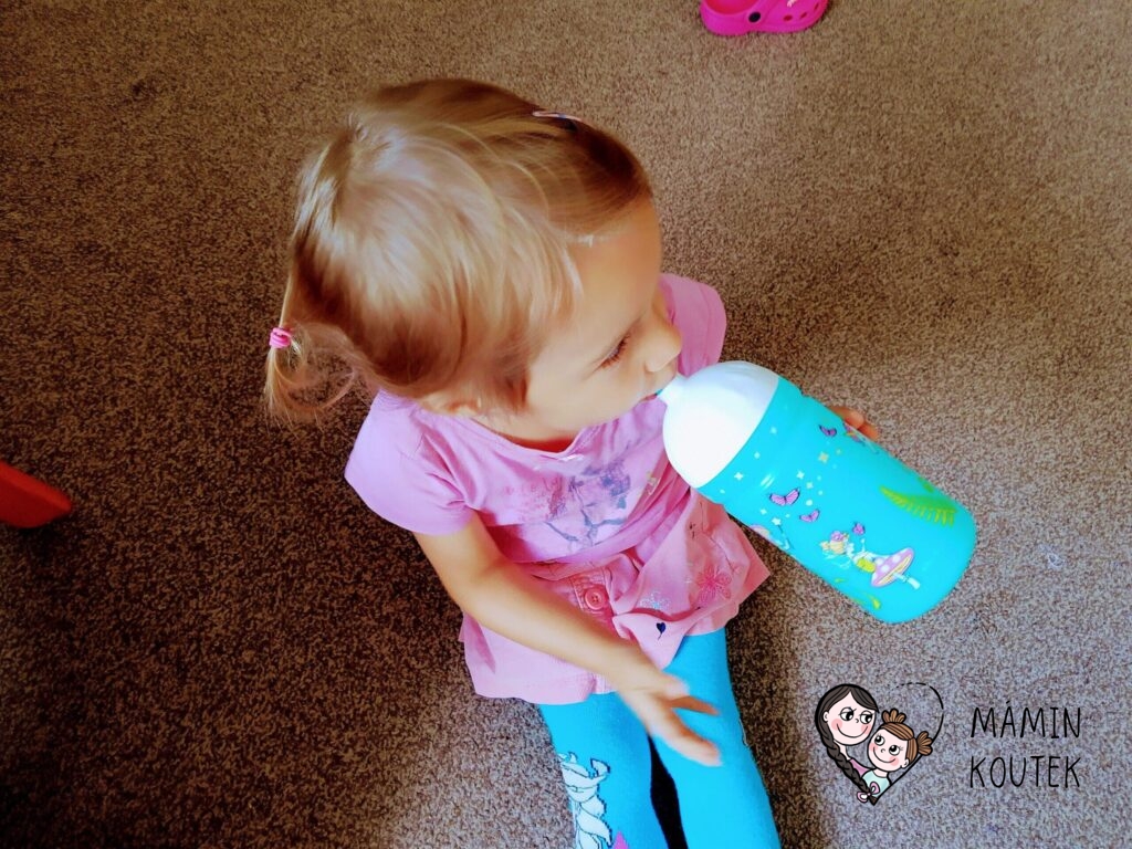 Zdravou láhev používáme každý den, převážně na vodu nebo čaj. Vyhovuje mi, že se dá mýt v myčce a snadno se plní, protože hrdlo je opravdu velké. Zátku je Beky (3 roky) schopna sama otevřít a pokud ji pořádně zavře, láhev neteče, což byl jeden z mých hlavních požadavků.