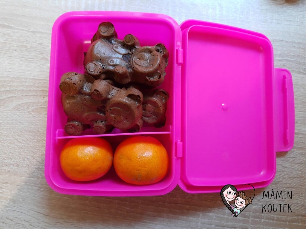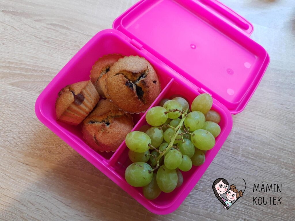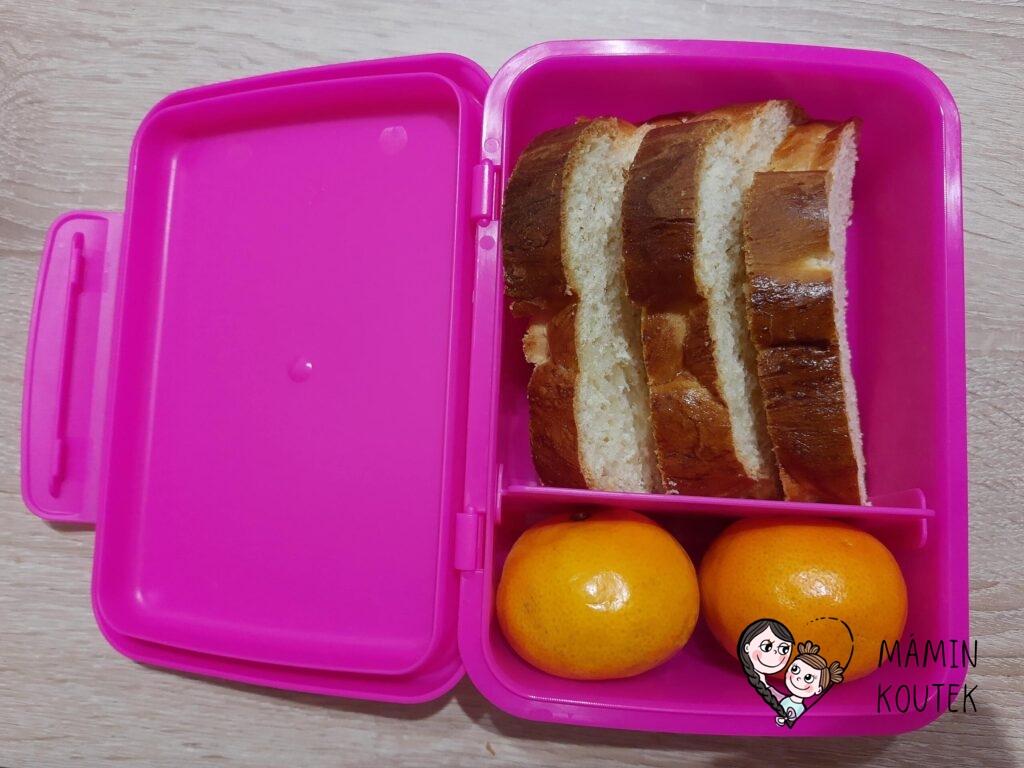 My nejčastěji dáváme do boxu svačinkový základ (obložený rohlík, chleba, tousty buchta, vánočka aj.) a k tomu ovoce, oříšky či zeleninu navíc. Box po zavření drží obsah oddělený, takže nevadí, pokud děti krabičku jen tak hodí do batůžku.