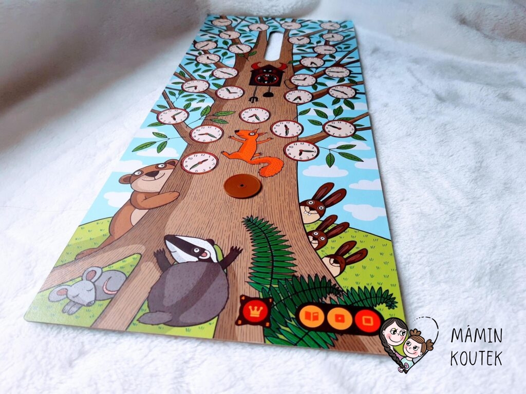 Hodiny mají rafičky, kterými lze různě pohybovat. Kolem jsou obrázky zvířat, slunce či měsíce. Nad hodinami je nakreslený hodinovník, což je pohádkový strom, který má na sobě jak ciferníkové, tak digitální hodiny. Stejný čas je znázorněn oběma způsoby, aby děti viděly rozdíl.