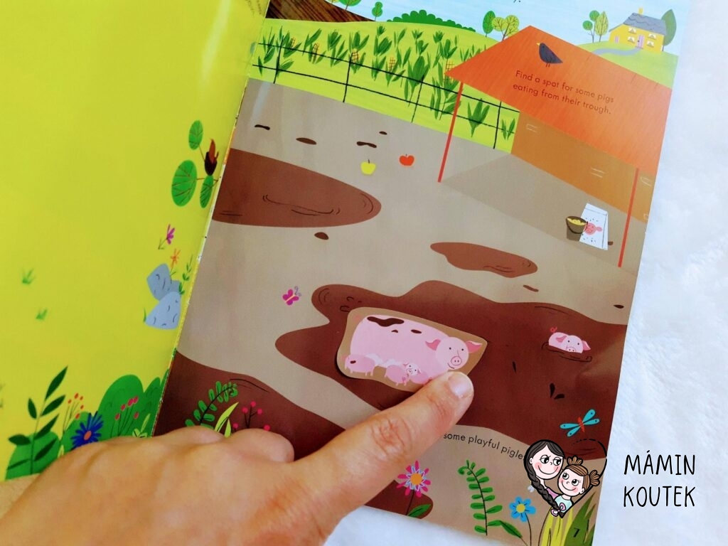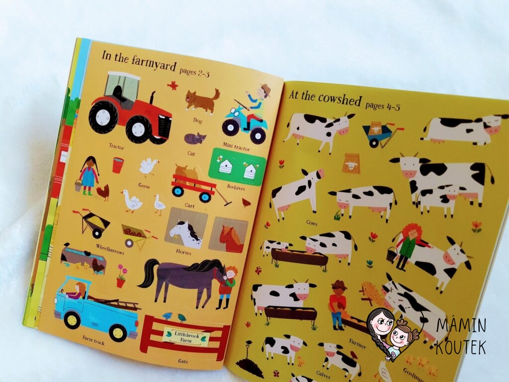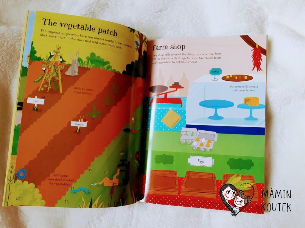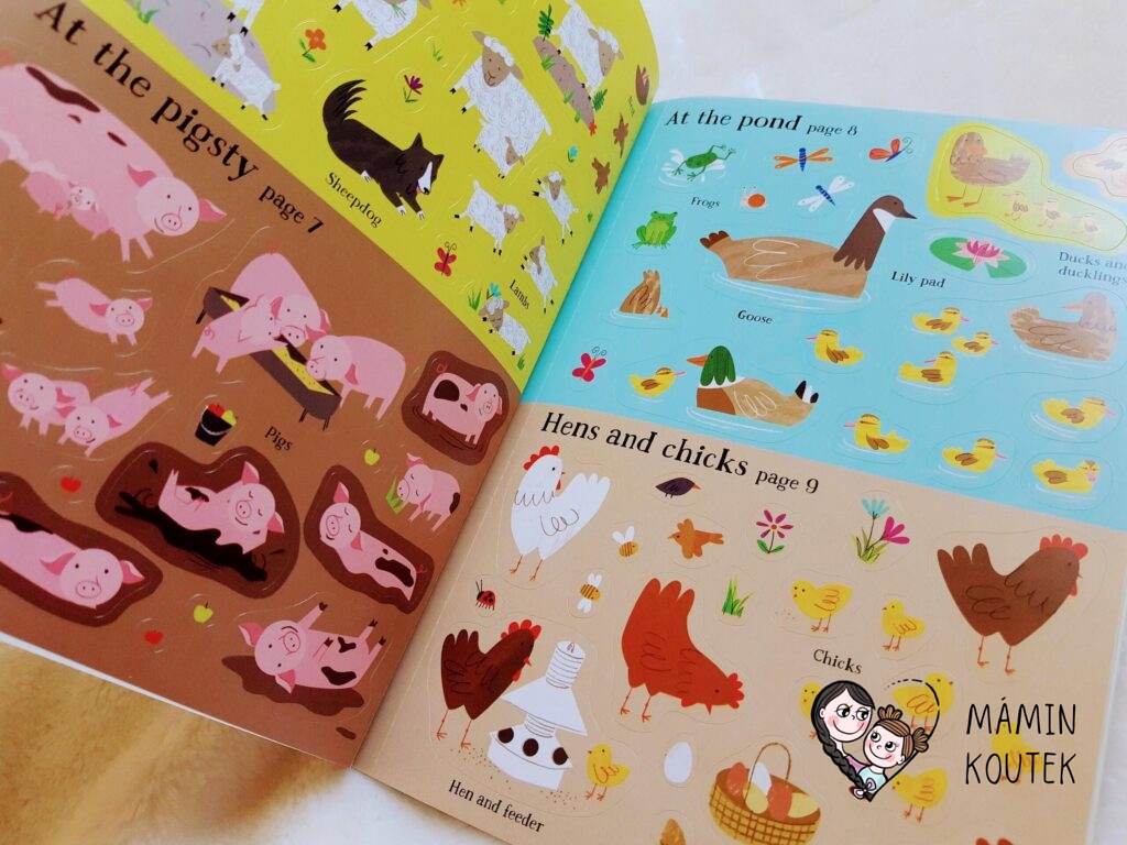 V knize najdeme několik výjevů ze života na farmě. V druhé části jsou pak nálepky, které děti mohou na stránky lepit. Nálepky jdou lepit opakovaně a jsou určeny vždy na konkrétní stránku. Samozřejmě pokud dítě bude chtít lepit jinak, není to problém. Oficiálně jsou ale ovce na louce, kačenky na rybníčku a podobně.